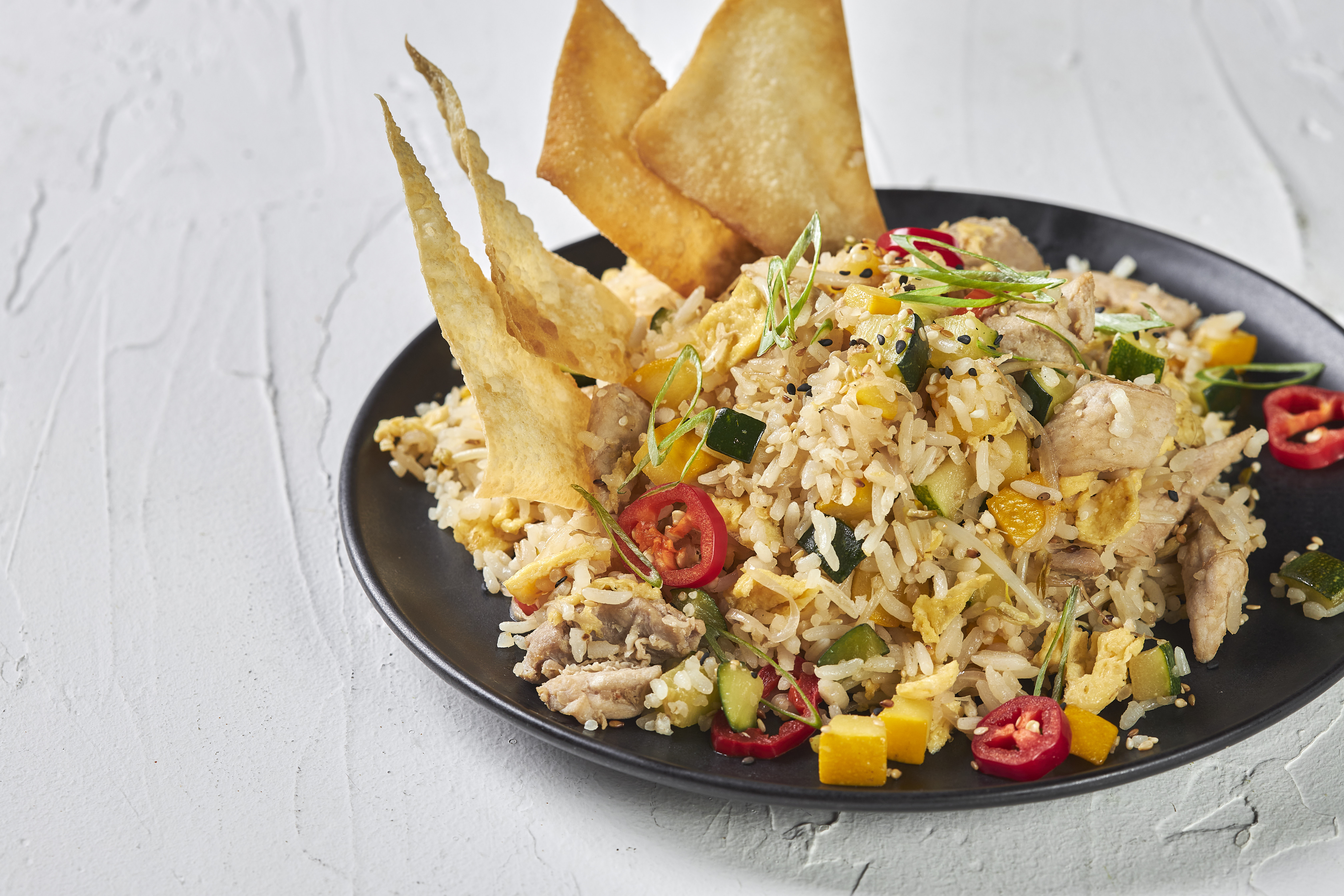 Arroz salteado con cerdo, vegetales y huevo en especias japonesas.