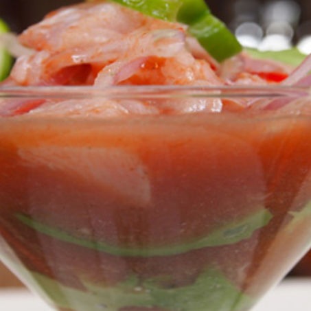 Preparación de camarones marinados en zumo de limón, bañados en salsa roja y especias tradicionales, acompañado de galletas de sal.