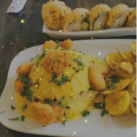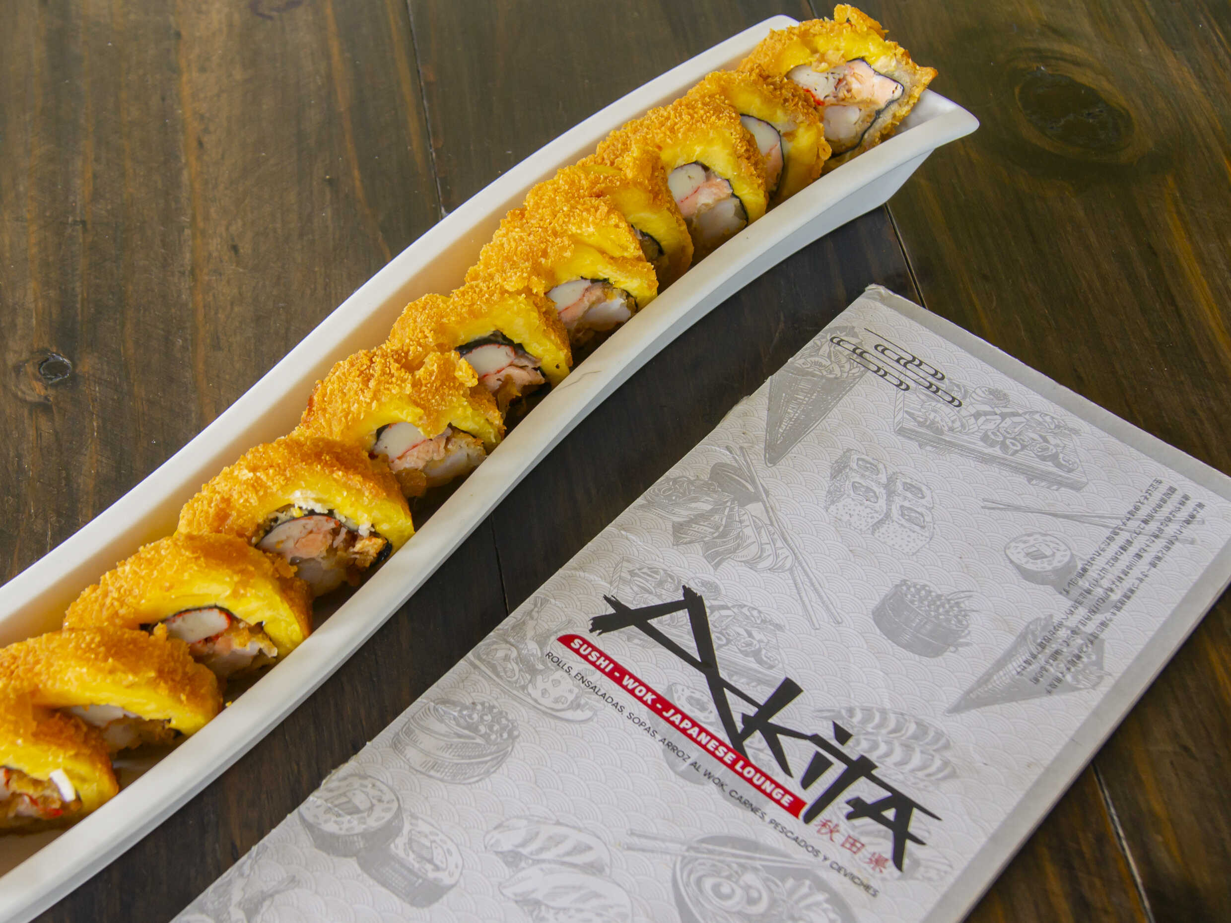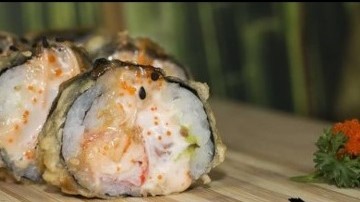 12 Bocados. Enrollado de plátano maduro, camarón, salmón y palmito de cangrejo, bañado en salsa dinamita. Apanado totalmente.