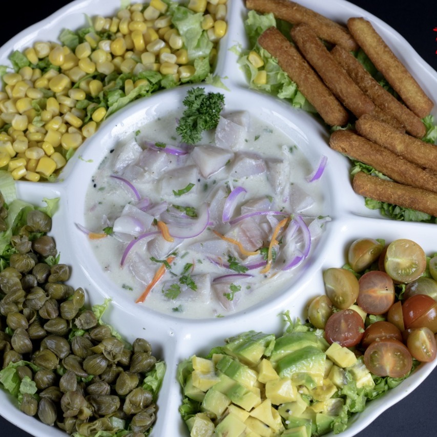 180 g De pescado blanco marinado en leche de tigre, ají y zumo de limón. Acompañado de aguacate, alcaparras con aceite de oliva, maíz cancha, tomates cherry y choclo.