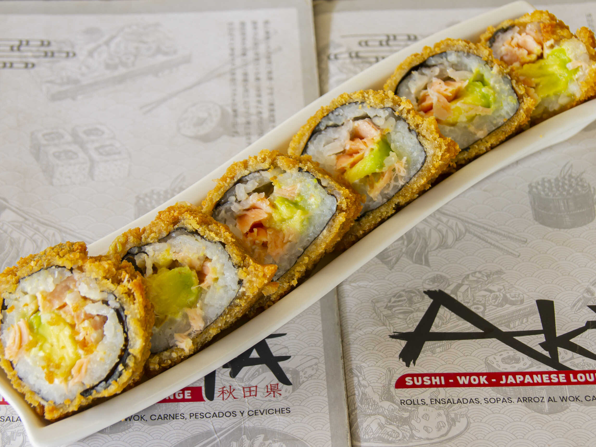 6 Bocados. Arroz japonés, relleno con salmón tempura, tocineta apanada y vegetales tempura, con tope de plátano maduro y aguacate.