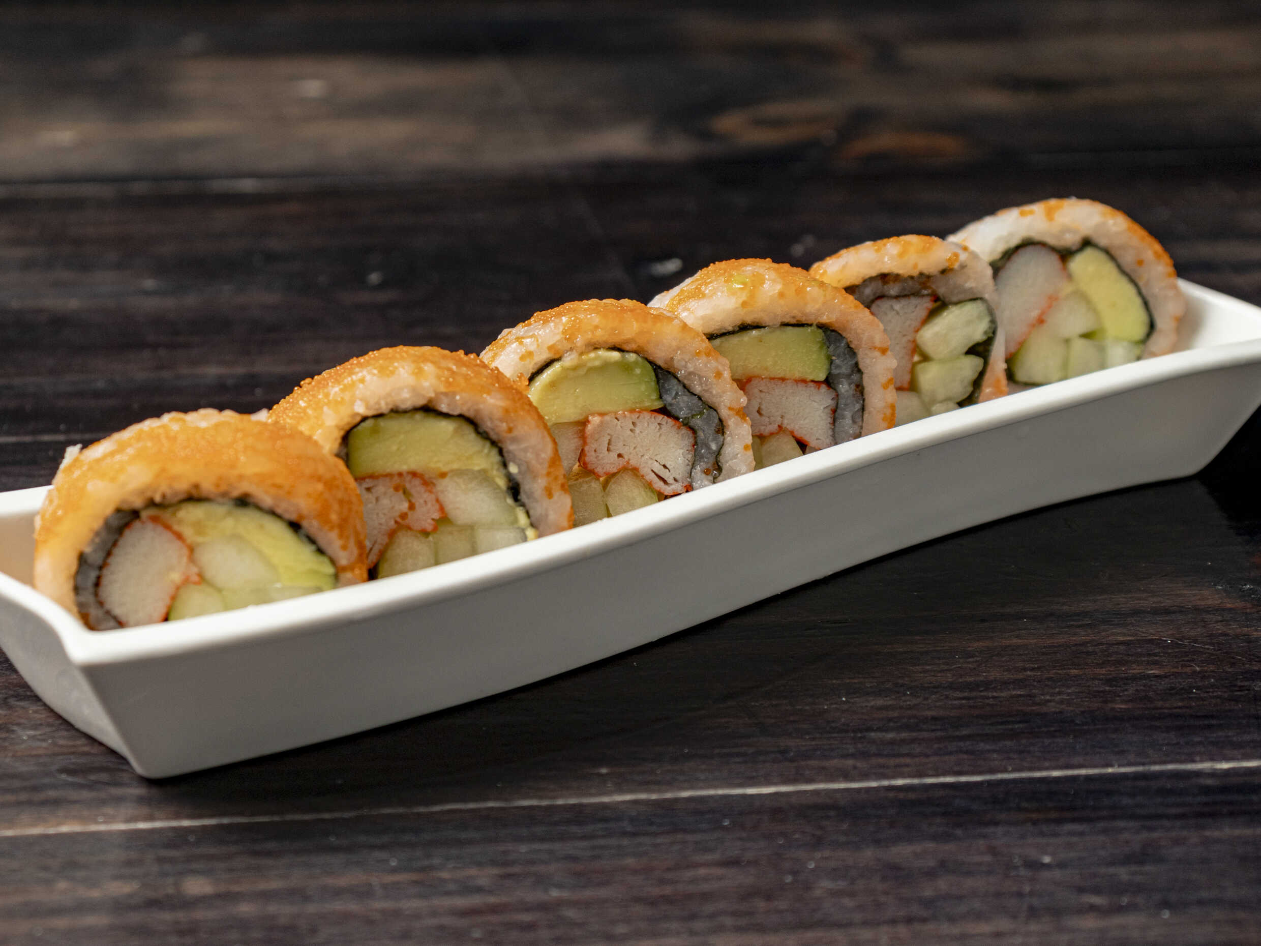 6 Bocados. Arroz japonés, relleno con masago, aguacate, palmito de cangrejo y salmón. Apanado totalmente.