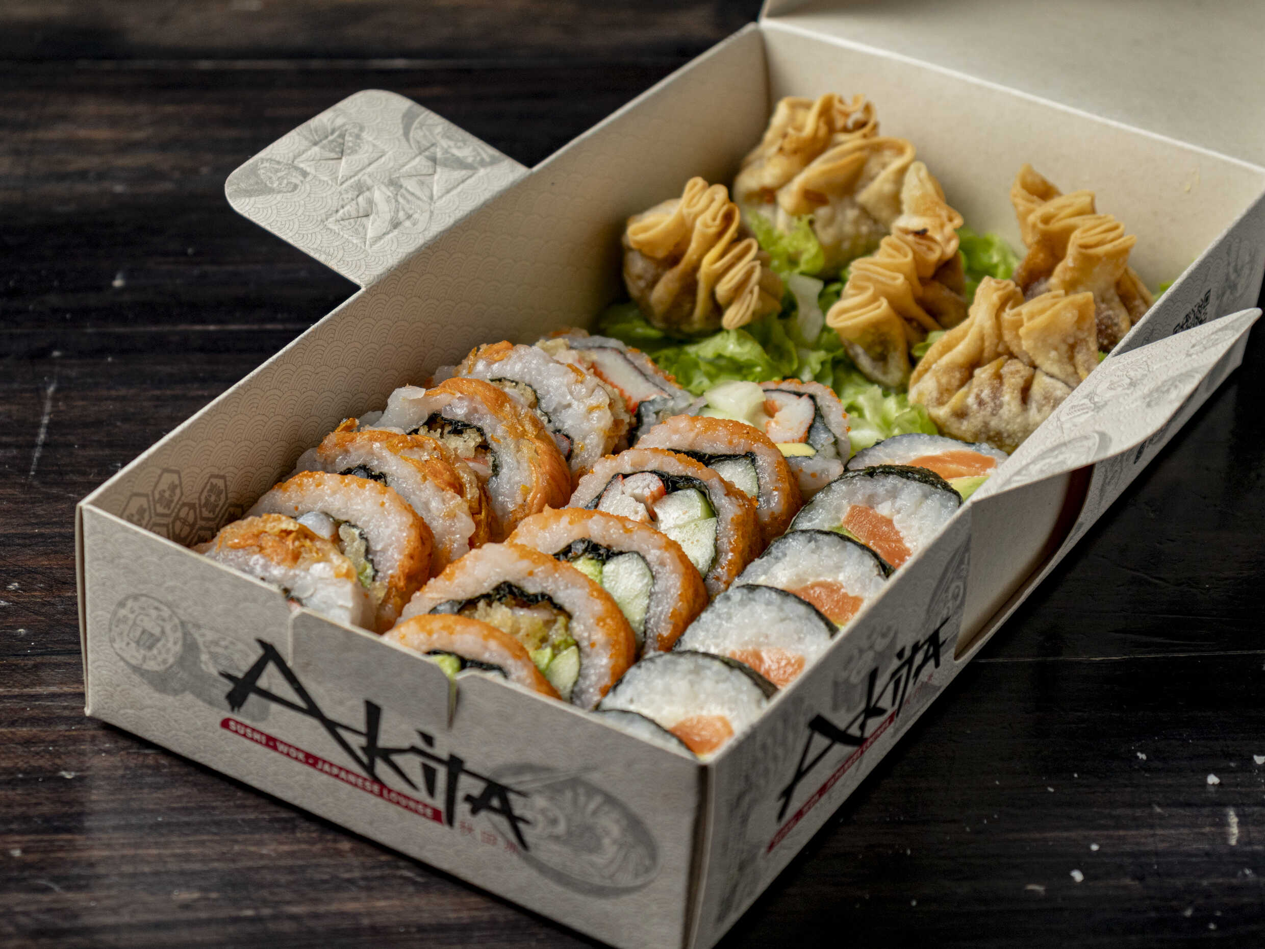 4 Medios rollos 1 clásico (6 bocados), 1 tempura (6 bocados) y 2 especiales (12 bocados), 3 naguiris de salmón o pescado blanco, 1 entrada (gyosas, rollitos de primavera, kani akita, camarones apanados o cóctel de camarones) y 1 gaseosa 1.5 L Coca-Cola.