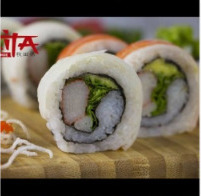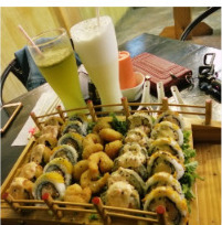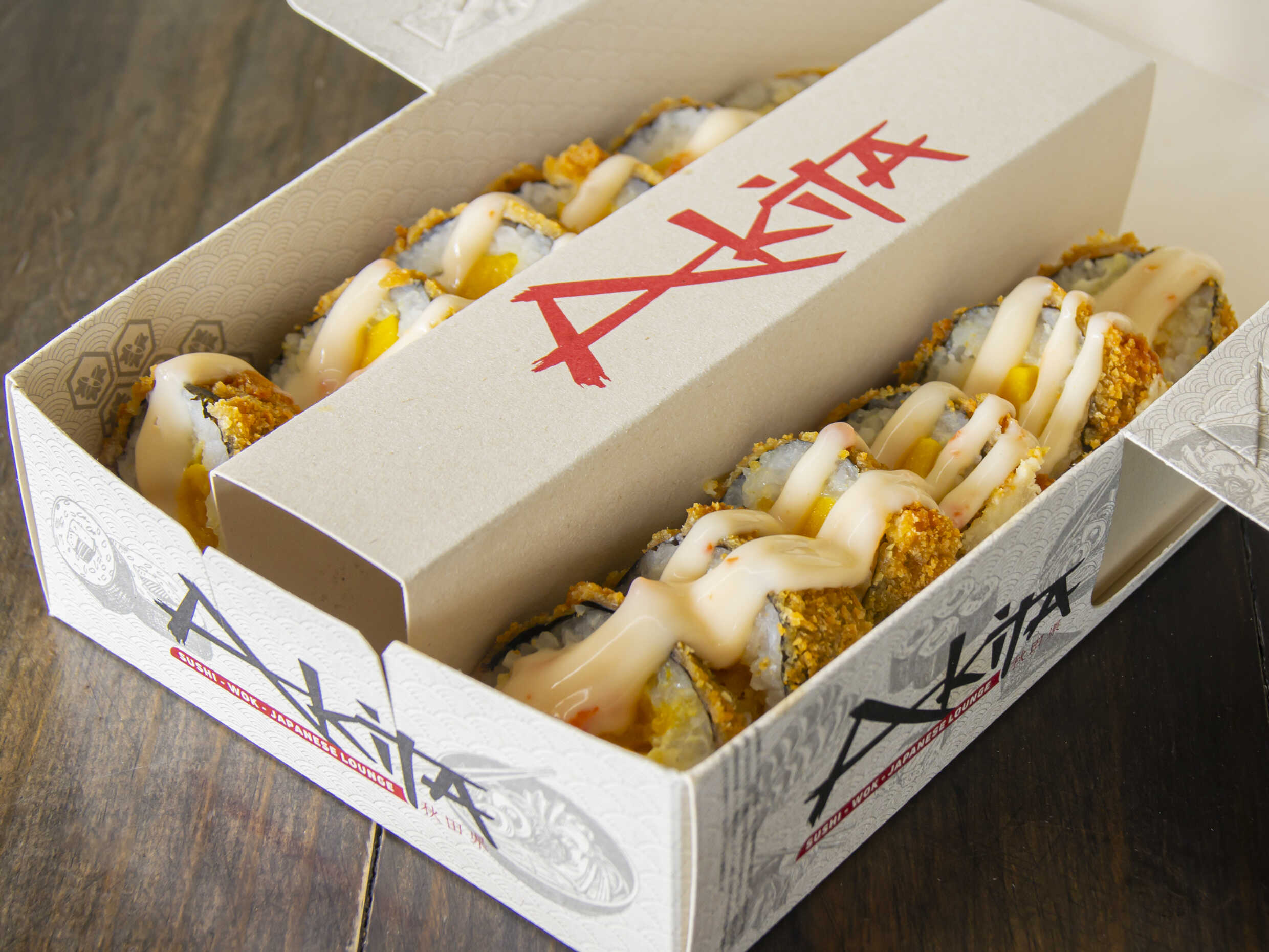 Recibes: 24 Bocados de arroz japonés, relleno de pescado blanco, queso crema y agucate con tope de coco sellado y bañado en salsa de mango.