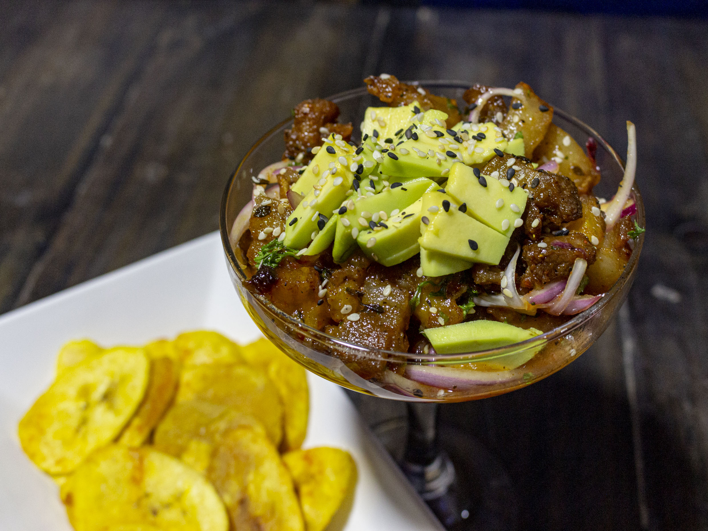 Chicarrones crocantes acompañados de maduritos, cebolla y aguacate marinados en zumo de limón.