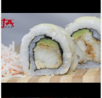 12 Bocados. Arroz japonés, relleno con camarón tempura, palmito de cangrejo, queso crema y tope de aguacate, bañado en salsa teriyaki.