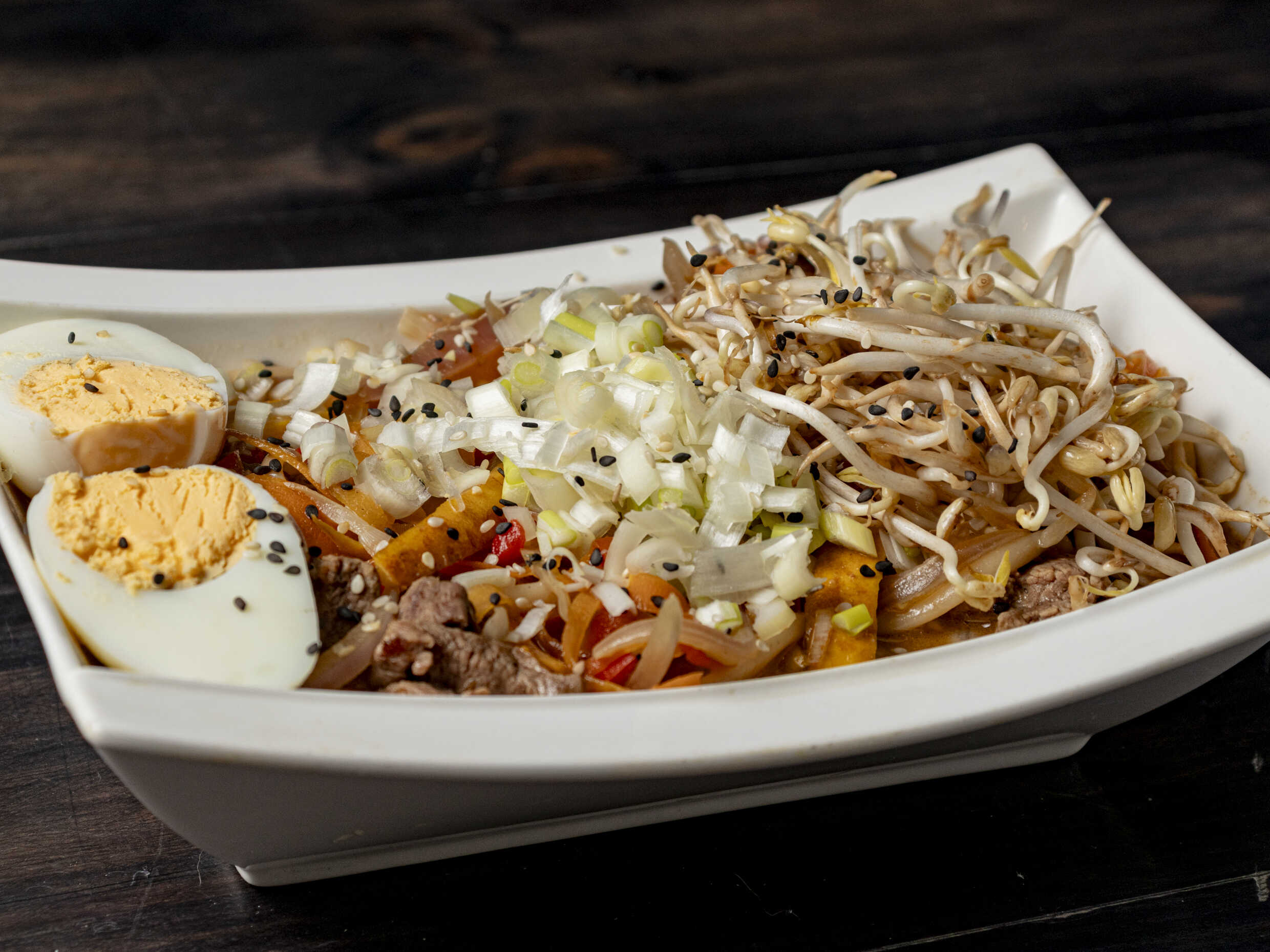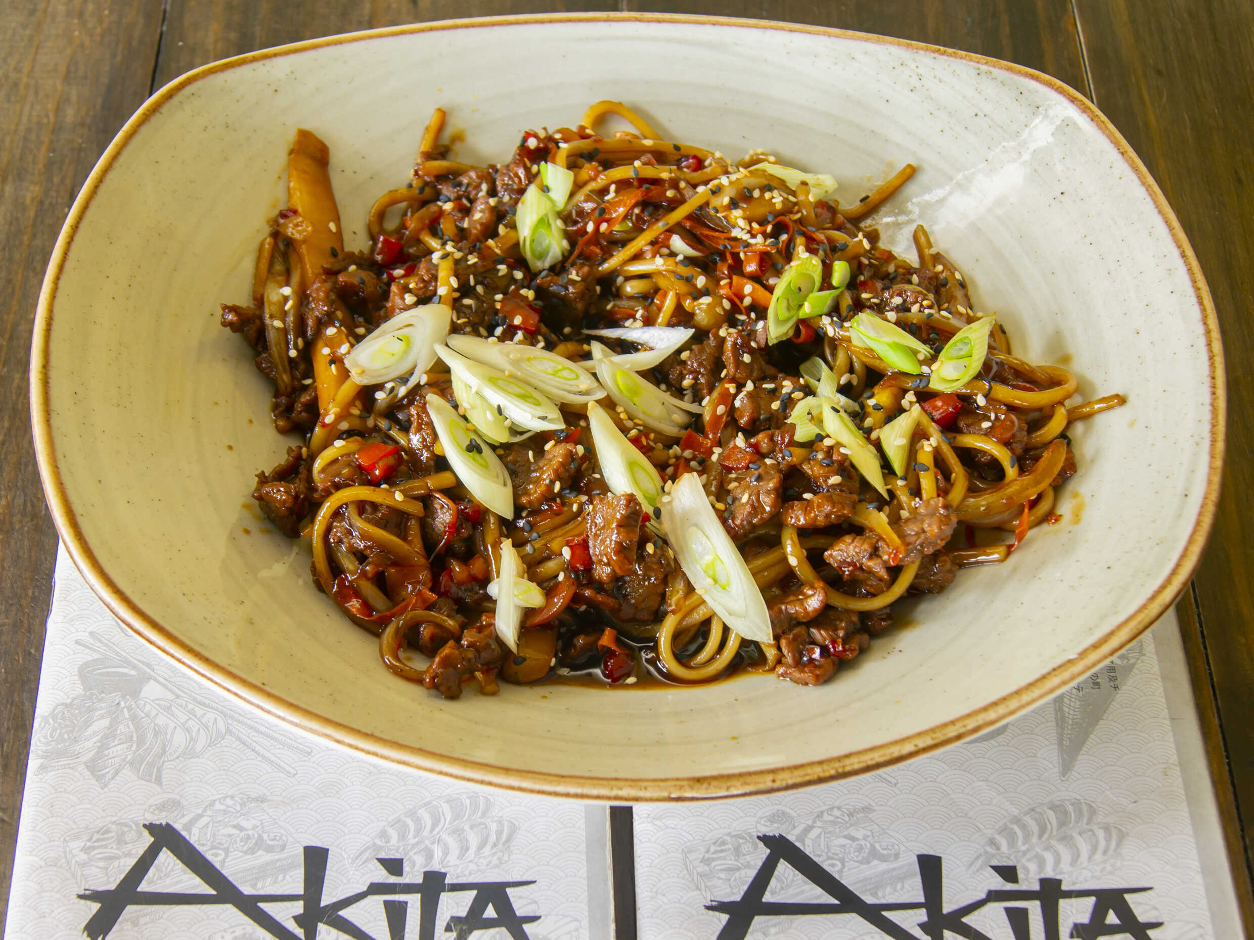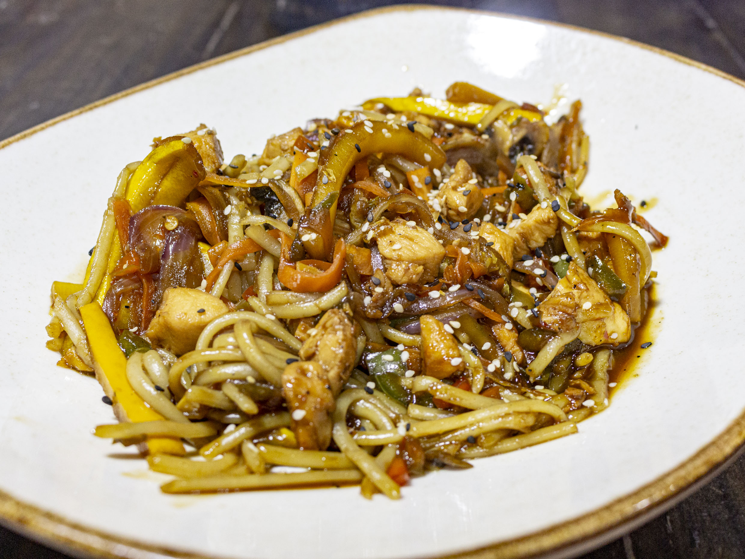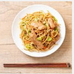 Pastas fideos con 200 g de lomo de cerdo, julianas de cebolla, pimentón y champiñones, aderezada con salsa yakisoba.