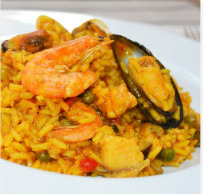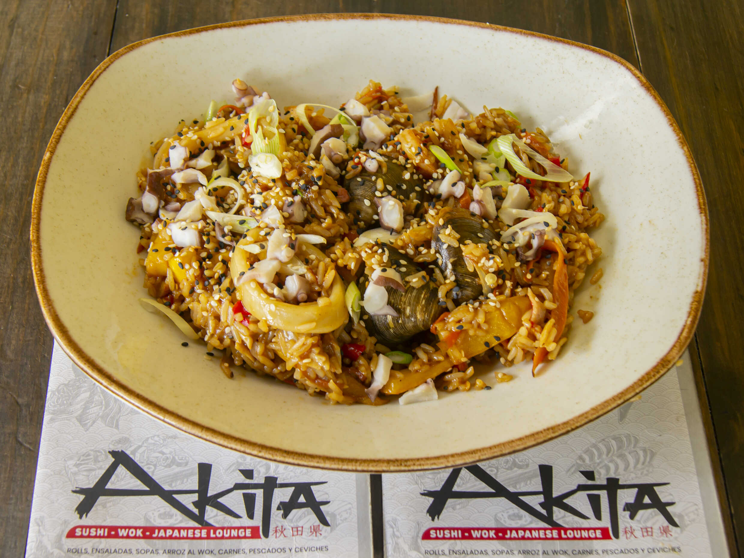 Arroz con solomito, pollo y mariscos marinados en especias japonesas, curry, leche de coco y vegetales salteados.