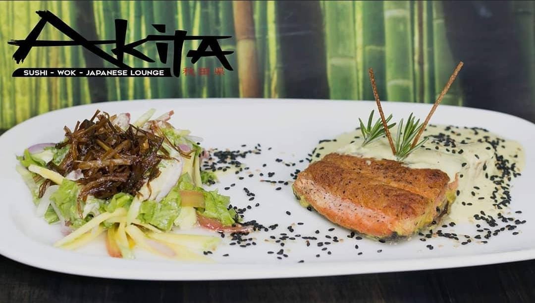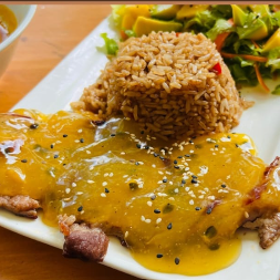 Disfruta un delicioso menú akita con un rico cerdo en salsa de maracuyá, acompañado en crema de zanahoria, arroz al wok, ensalada de temporada y bebida del día