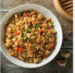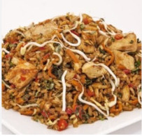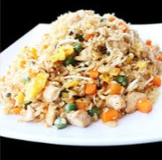 Arroz con 200 g de pollo, huevo, verduras frescas y raíces chinas, aromatizado con aceite de sésamo.