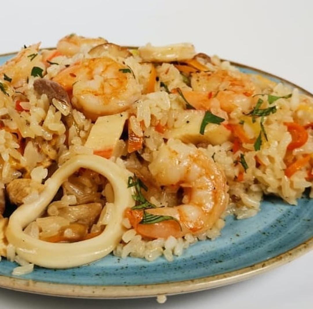 Arroz con camarones, pulpo, calamar, almejas, mejillones y vegetales salteados, bañados en leche de coco y teriyaki de la casa.