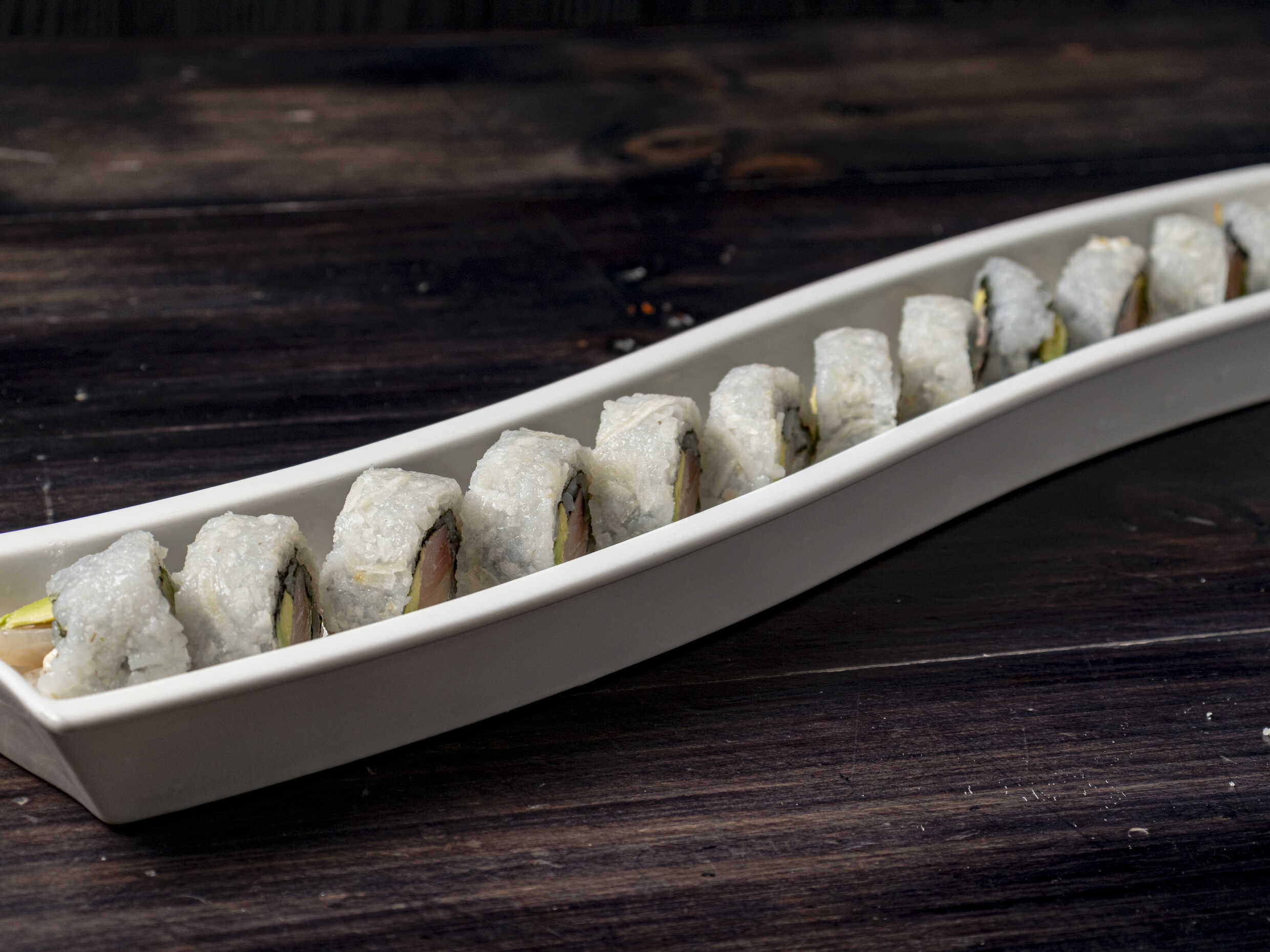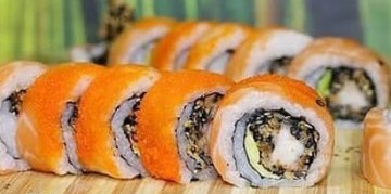 12 Bocados. Arroz japonés, relleno con masago, aguacate, palmito de cangrejo y salmón. Apanado totalmente.