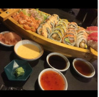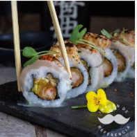 6 Bocados. Arroz japonés, relleno de salmón, atún, palmitas de cangrejo, caviar y aguacate. Bañado en salsa dinamita.