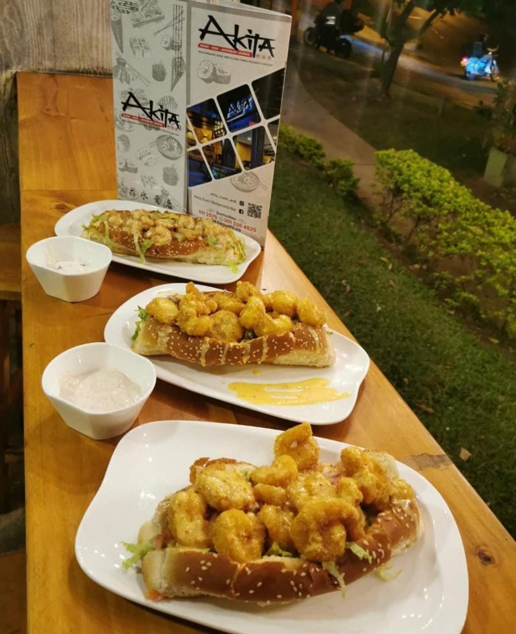 Delicioso perro caliente con 200 g de camarones enteros apanados, lechuga, cebolla, tomate y salsa especial de la casa.