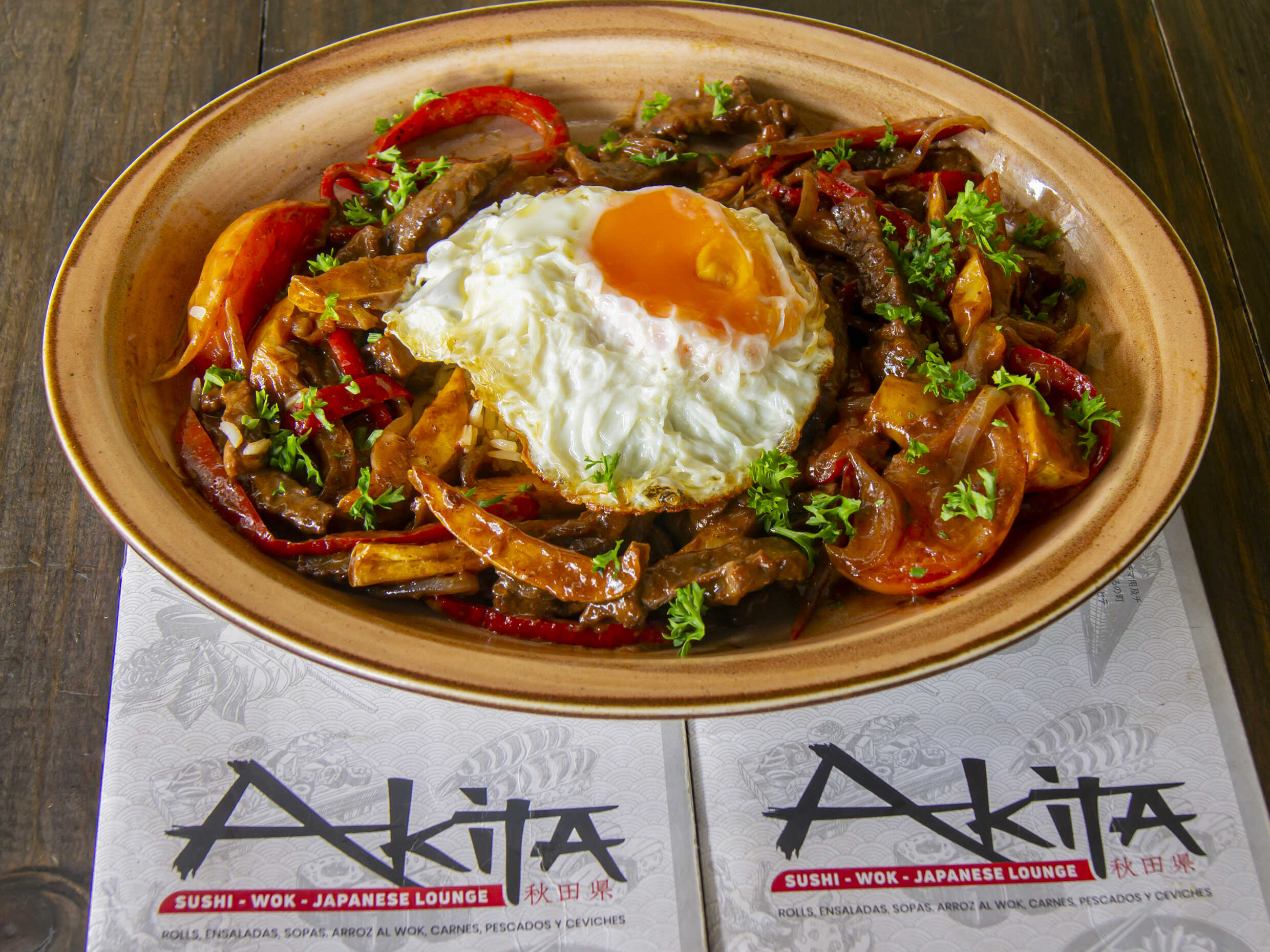 250 g De solomito marinado en especias, salsa de soya, vegetales salteados, papas, huevo y arroz.