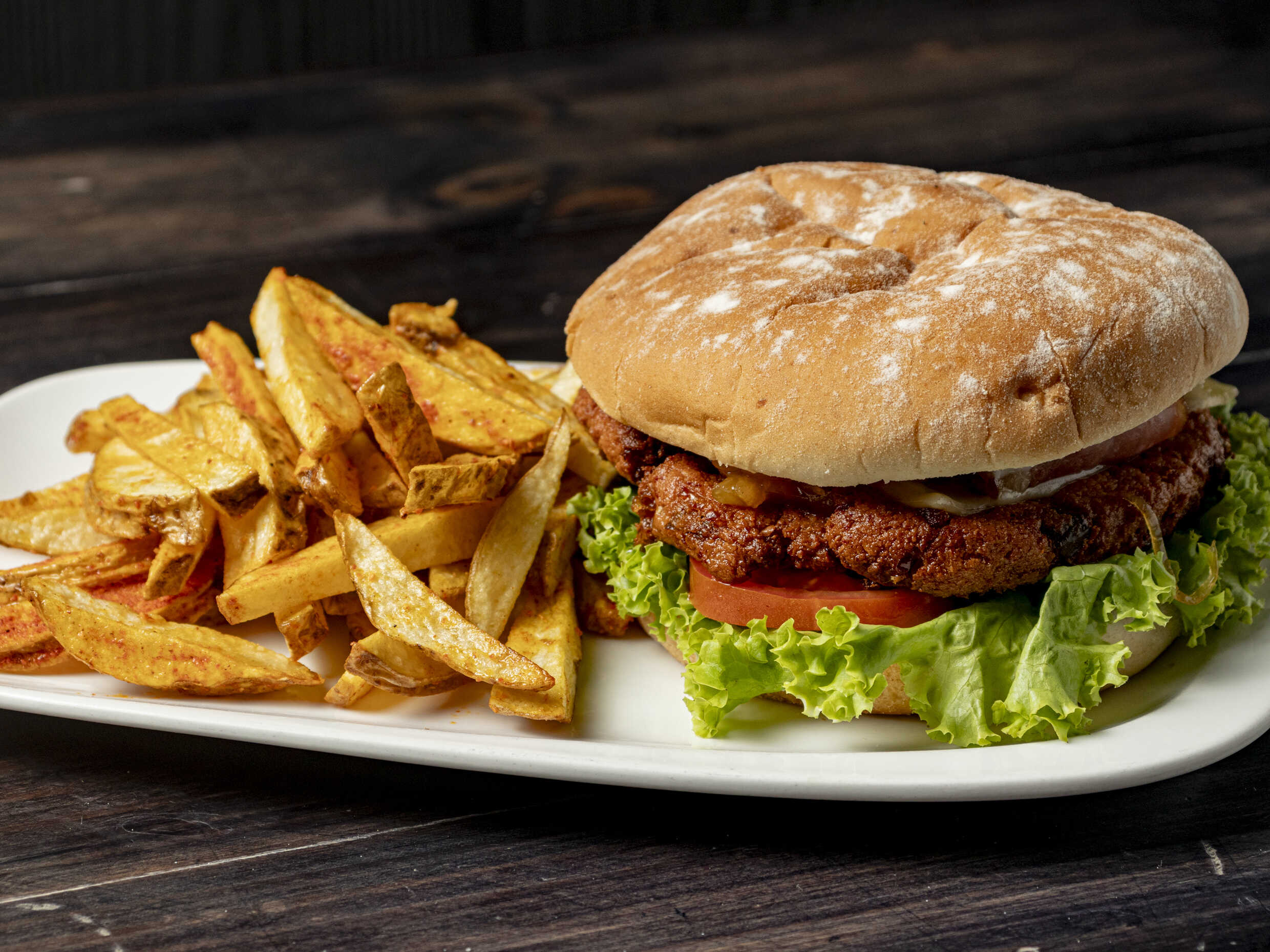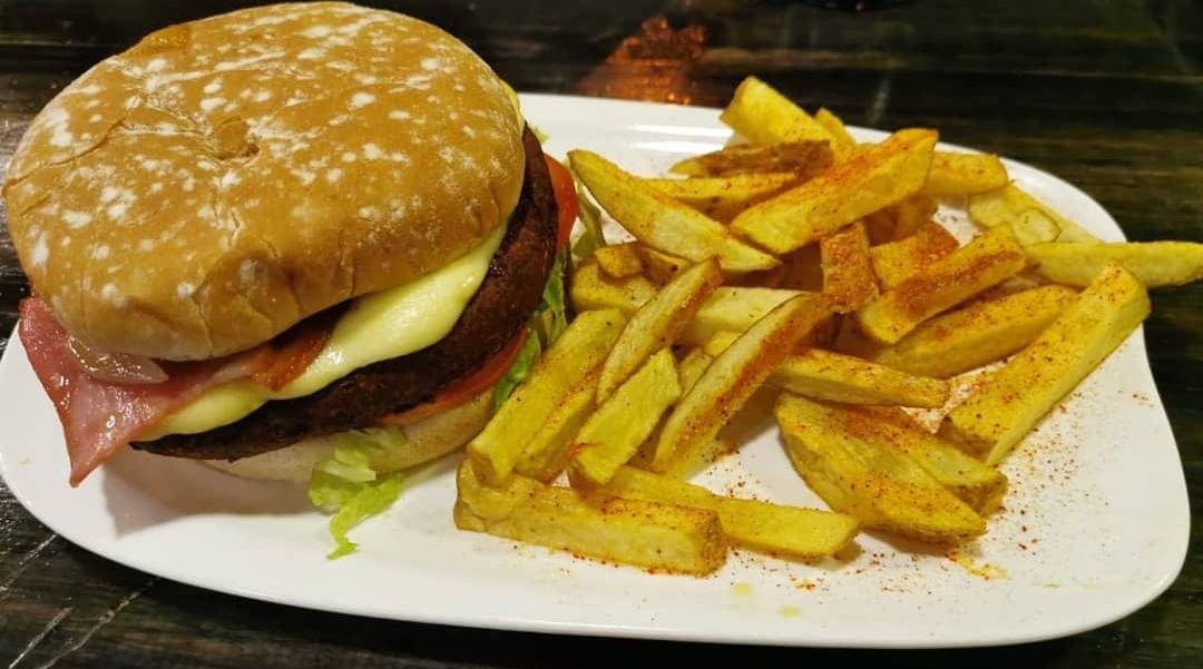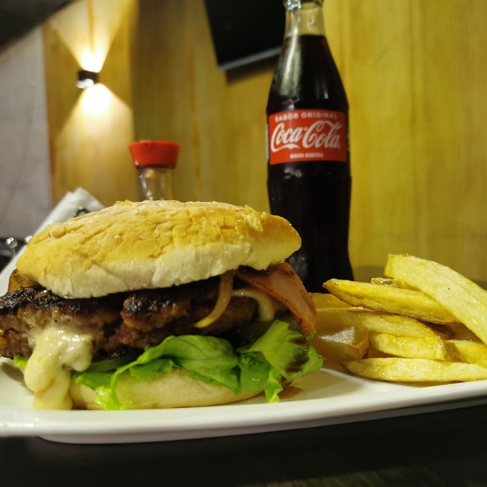 Deliciosa hamburguesa de carne de res, rellena de queso mozzarella, vegetales frescos y tiras de tocineta. Acompañada de papas a la francesa.