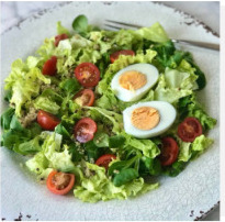 Mézclum de lechugas, huevo cocido y vegetales frescos (zanahoria, tomates cherry, pepino, mango, y maíz tierno).