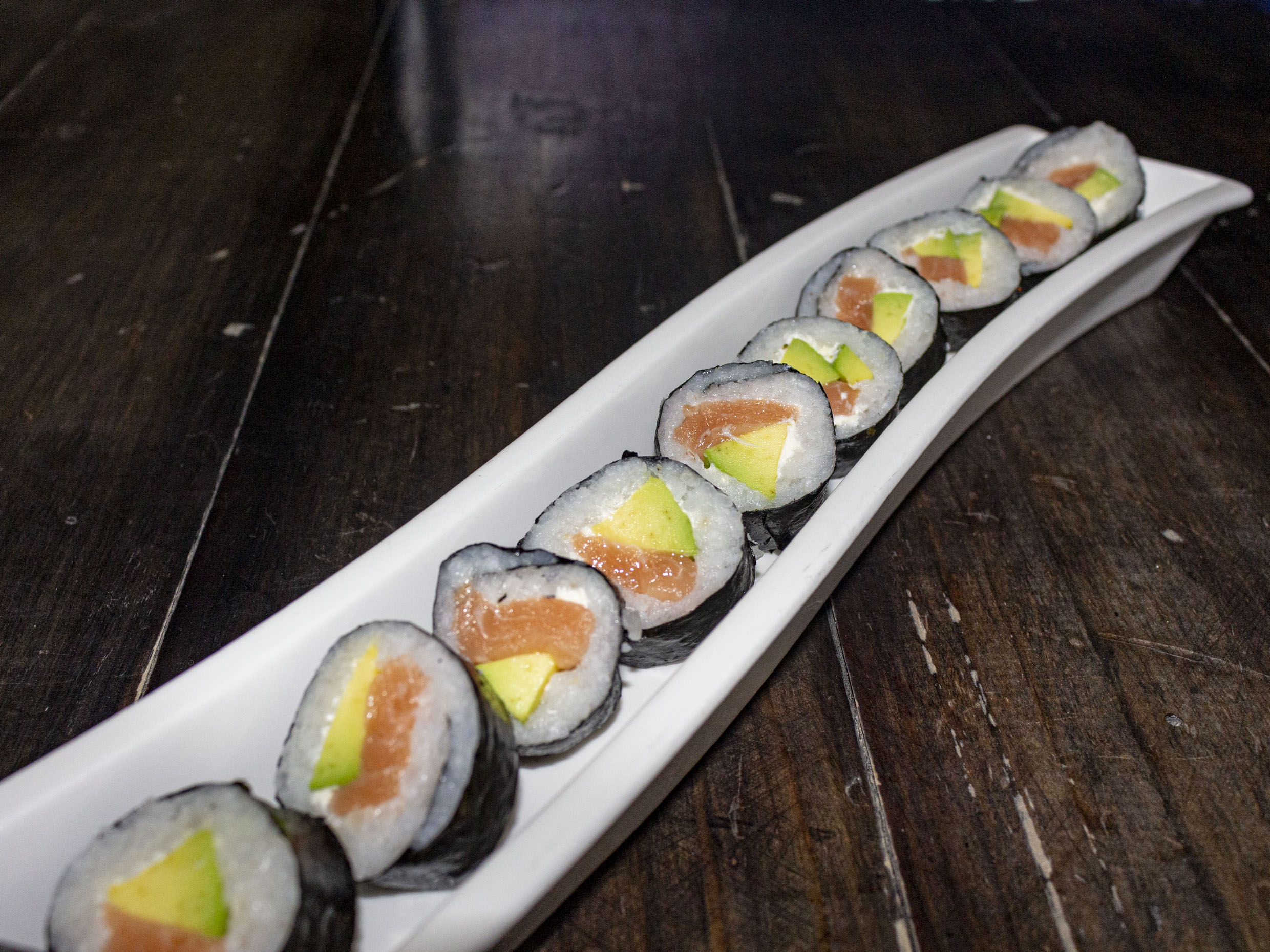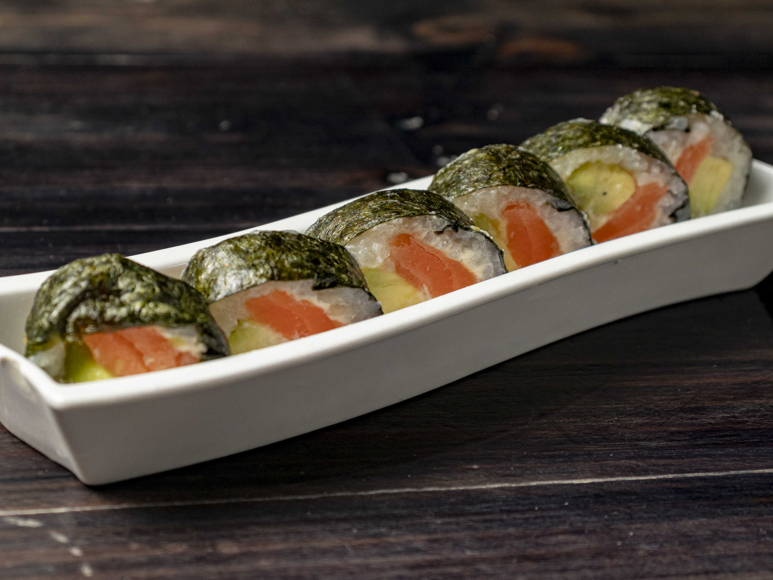 6 Bocados. Arroz japonés, relleno de salmón, aguacate y queso crema.