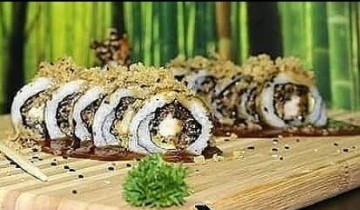 6 Bocados. Arroz japonés, relleno de langostinos rebozados en ajonjolí, queso crema y aguacate. Envuelto en anguila y ajonjolí y bañado en teriyaki caliente con chispas de tempura.