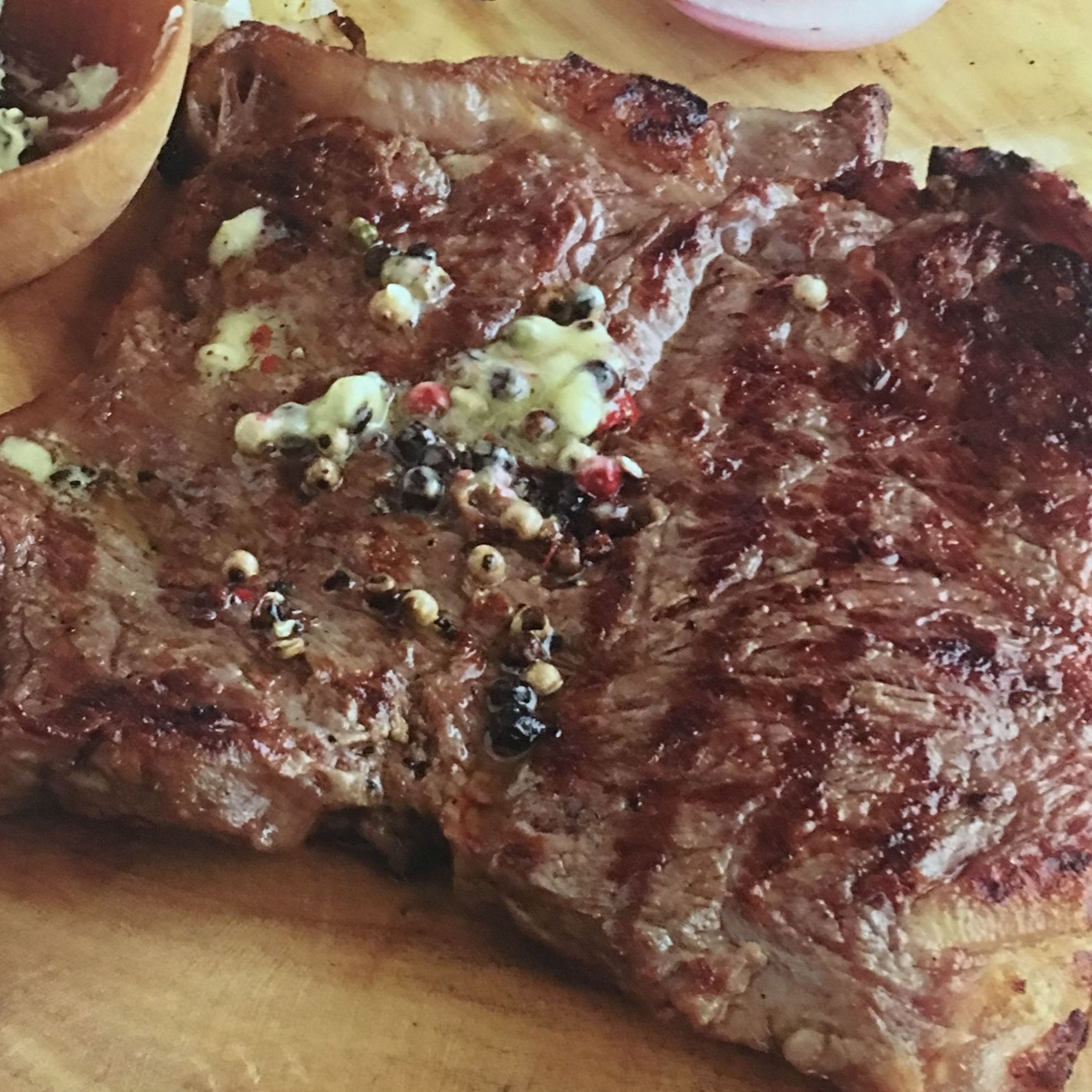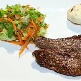 Corte grueso de solomo de res por 250 g acompañado de papas rústicas y ensalada de la huerta.