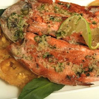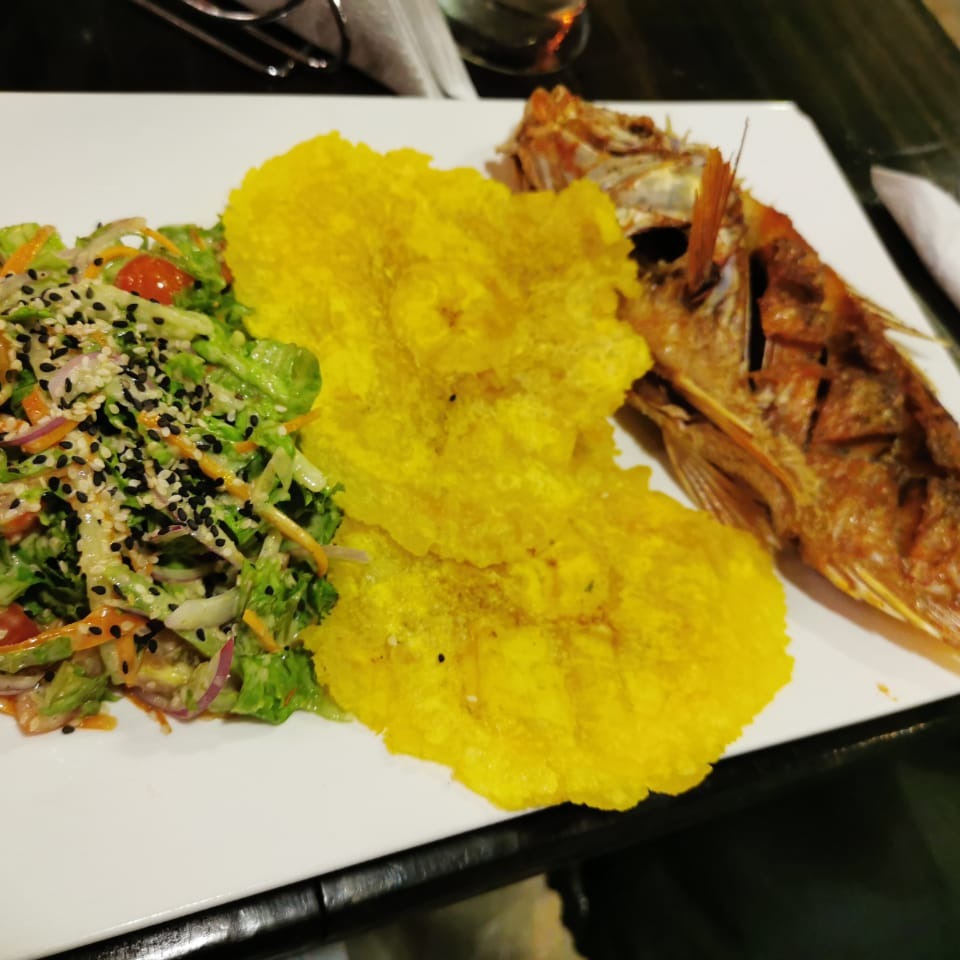Tilapia acompañada con patacones y ensalada de la huerta.