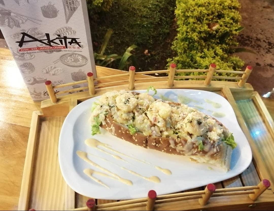 6 Bocados. Arroz japonés, relleno de salmón, palmitos de cangrejo, queso crema y aguacate. Bañado en salsa acevichada.