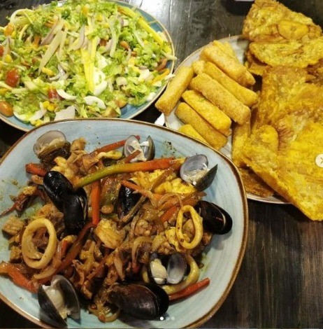 100 g De res, 100 g de cerdo y 100 g de pollo, acompañadas de 100 g de frutos del mar (pulpo, calamar y camarón), patacones, yuca frita y ensalada de campo.