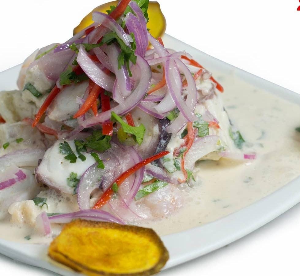 El clásico ceviche inca a base de pescado blanco con cebolla, marinado en limón y especias éxoticas. Acompañado de tostones de plátano verde.