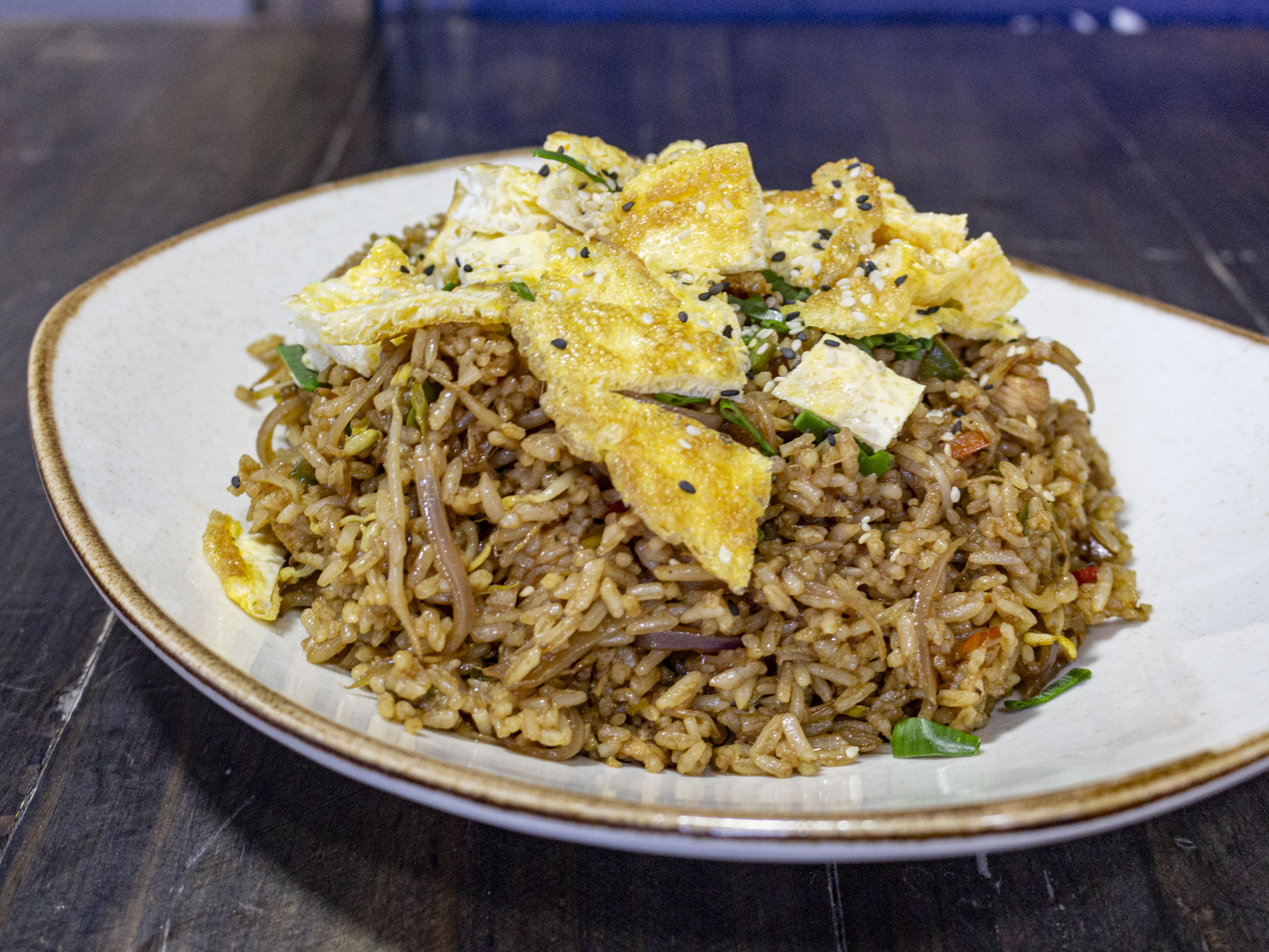 Arroz con 200 g de solomito, huevo, verduras frescas y raíces chinas, aromatizado con aceite de sésamo.