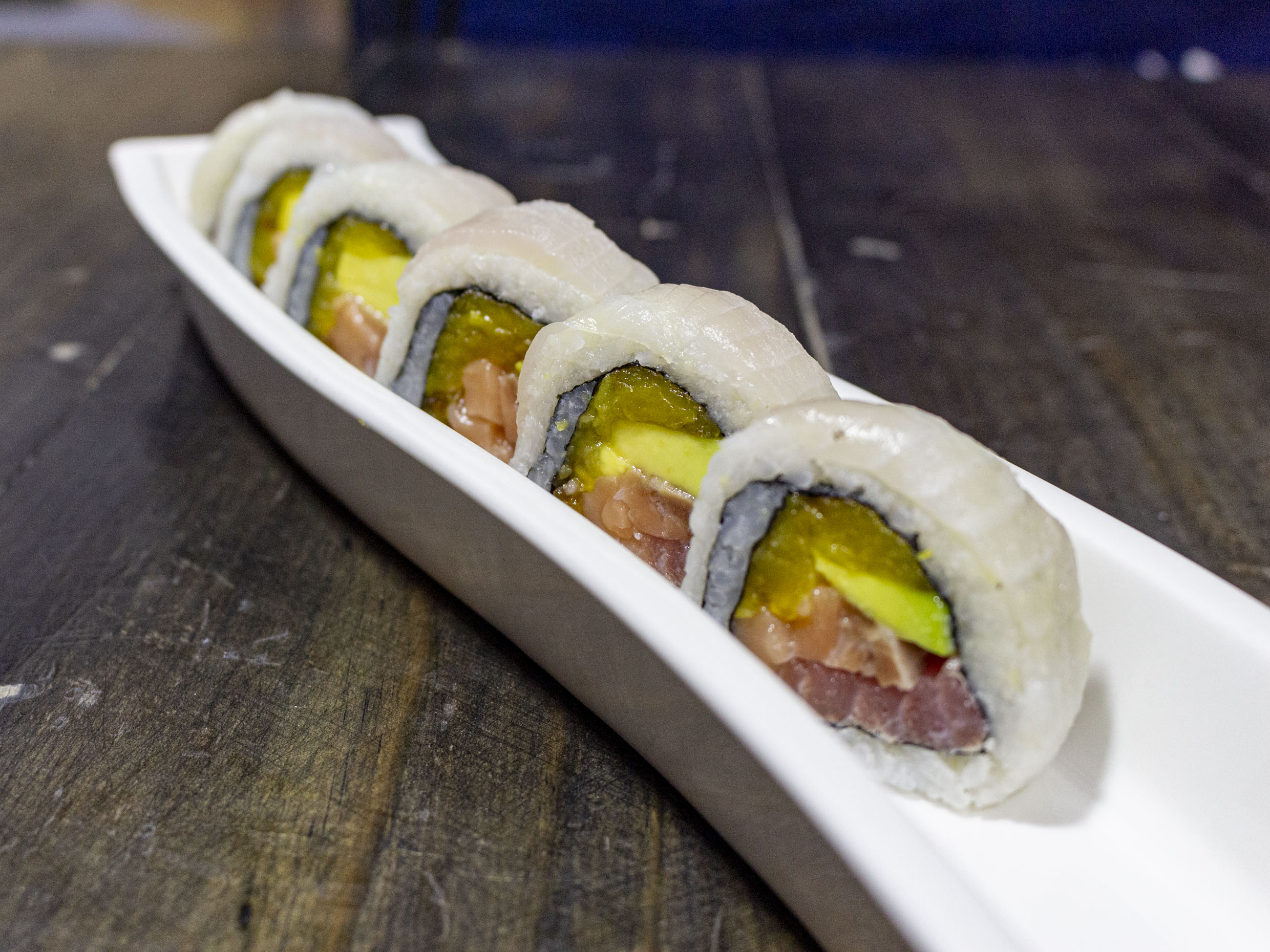 6 Bocados. Arroz japonés, relleno de salmón, atún, aguacate, plátano maduro y queso crema, con tope depescado blanco bañado en aceite de sésamo.