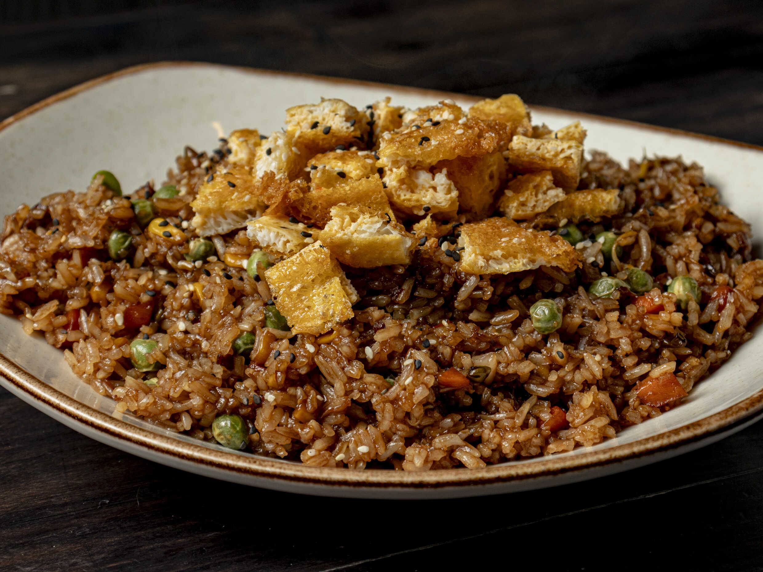 Arroz con vegetales salteados al wok con soya y salsa teriyaki, aromatizado con aceite de sésamo.