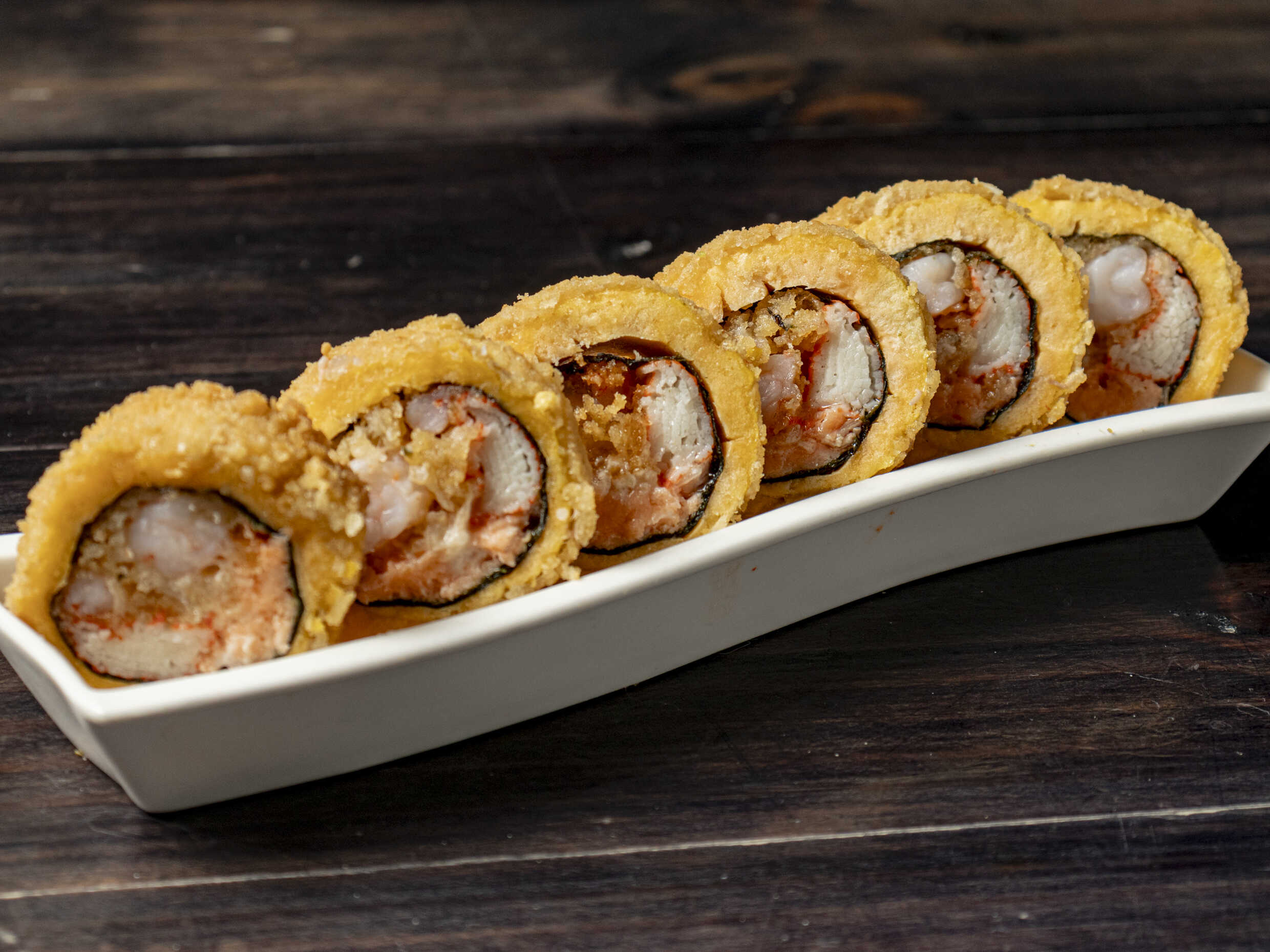 6 Bocados. Enrollado de plátano maduro, camarón, salmón y palmito de cangrejo, bañado en salsa dinamita. Apanado totalmente.