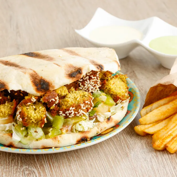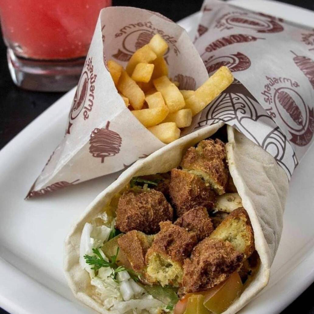 Shawarma falafel, papas a la francesa, pan árabe, tahine, tomate, lechuga, cilantro y salsas de la casa.