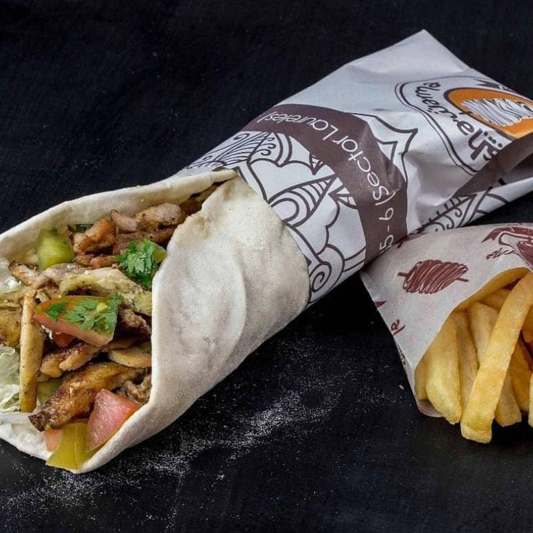 Shawarma pollo + papas a la francesa. Pan árabe, tahine , tomate, lechuga , cilantro salsas de la casa.