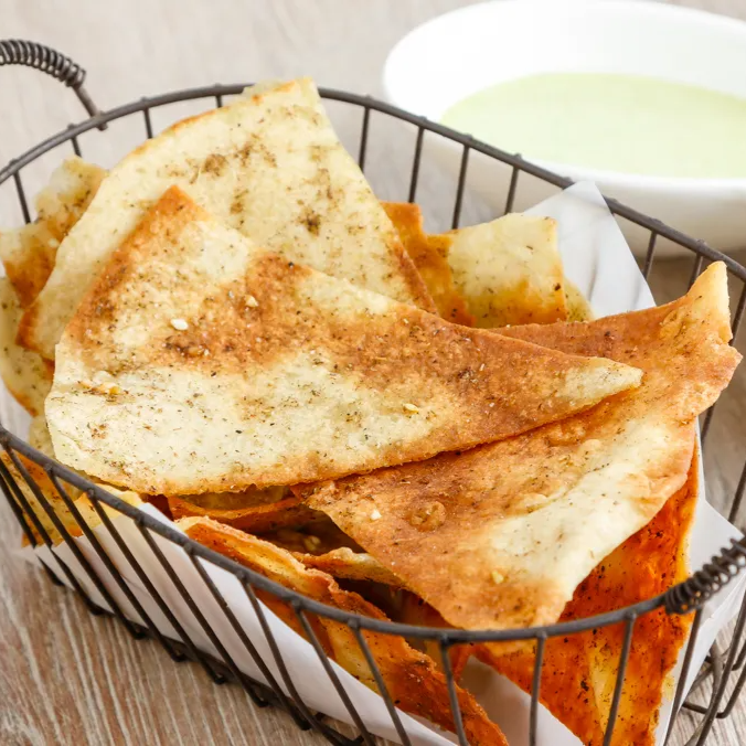 Tostadas de pan árabe deshidratado con zatar, acompañado de salsa de hiervas y ajo.