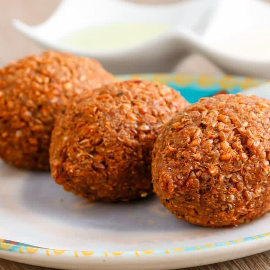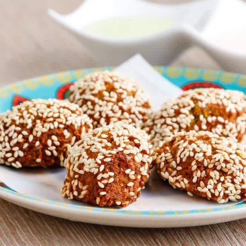 Croquetas de garbanzos x 5 con ajonjolí, acompañadas de salsas de la casa.