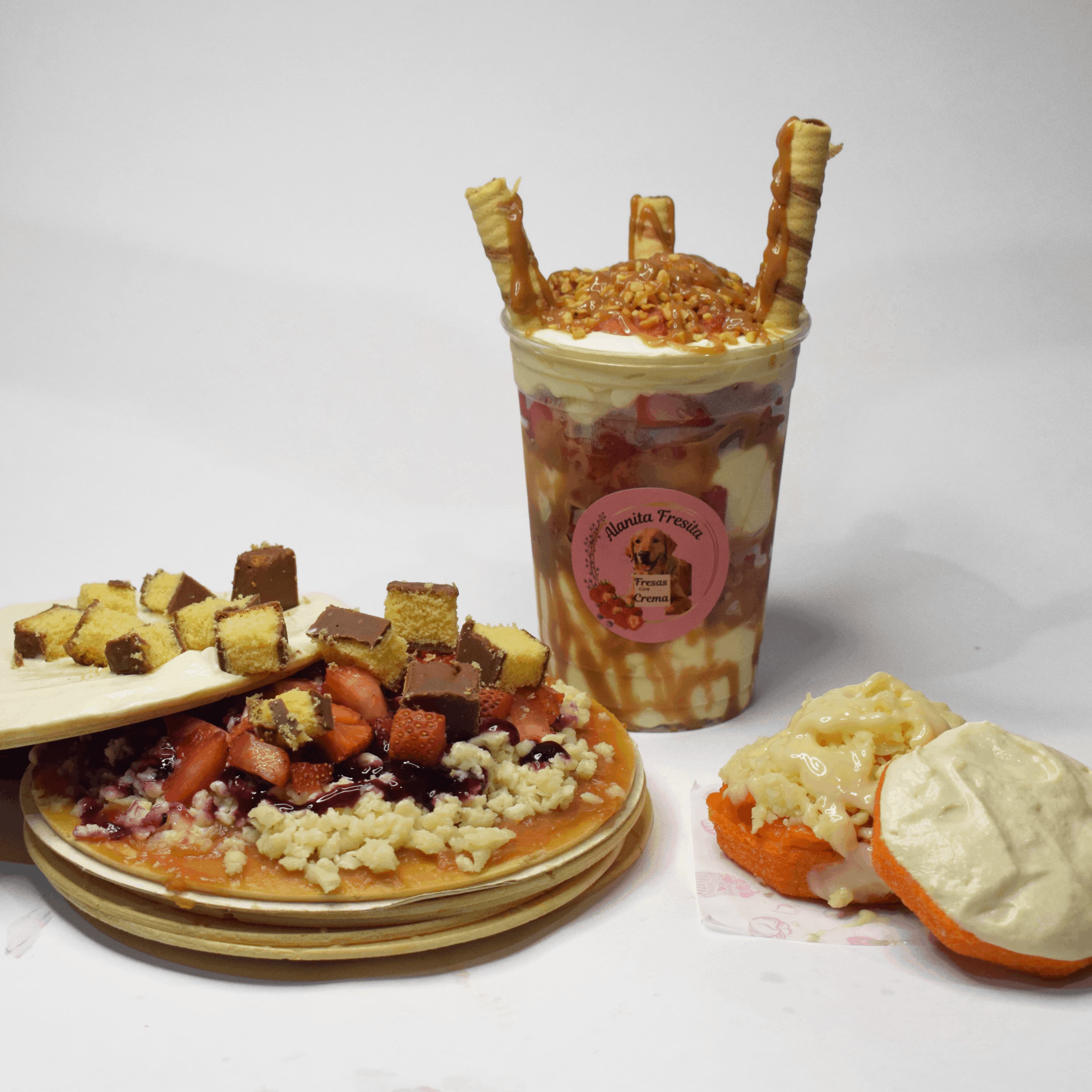 2 Galletas de oblea, arequipe, queso rallado, nuestra deliciosa crema artesanal, fresa picada, durazno picado, 2 salsas a elección, 1 topping a elección.