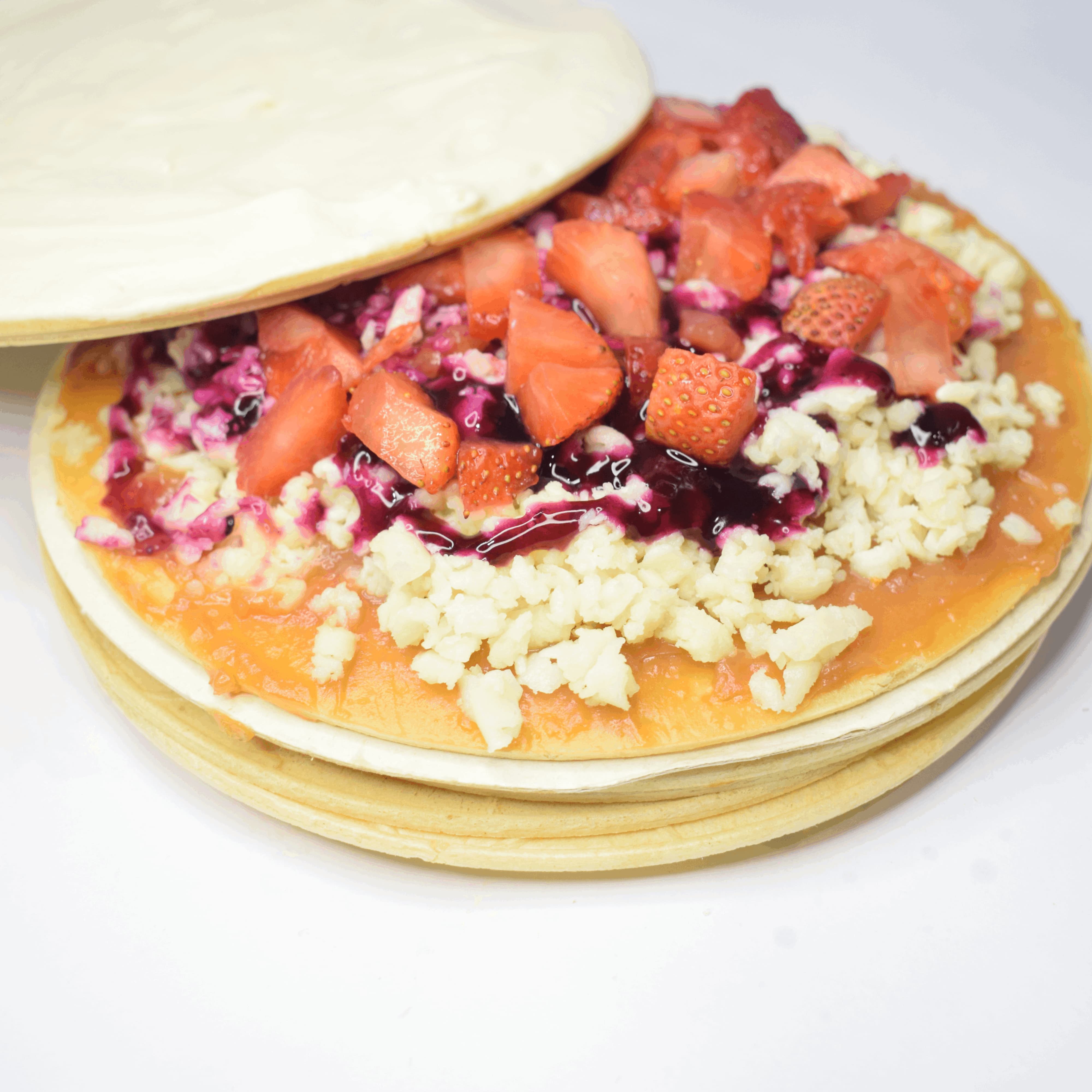 2 Galletas de oblea, arequipe, queso rallado, nuestra deliciosa crema de leche artesanal, fresa picada, 1 salsa a elección.
