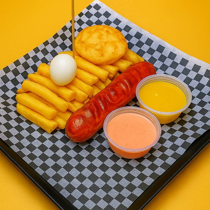 300 g De papas a la francesa, chorizo, huevos de codorniz, arepita