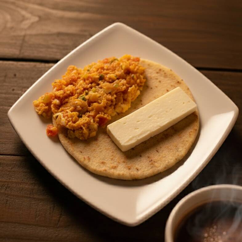 Arepa de maíz asada, acompañada de huevo revuelto . Porción de quesito. Un desayuno completo.