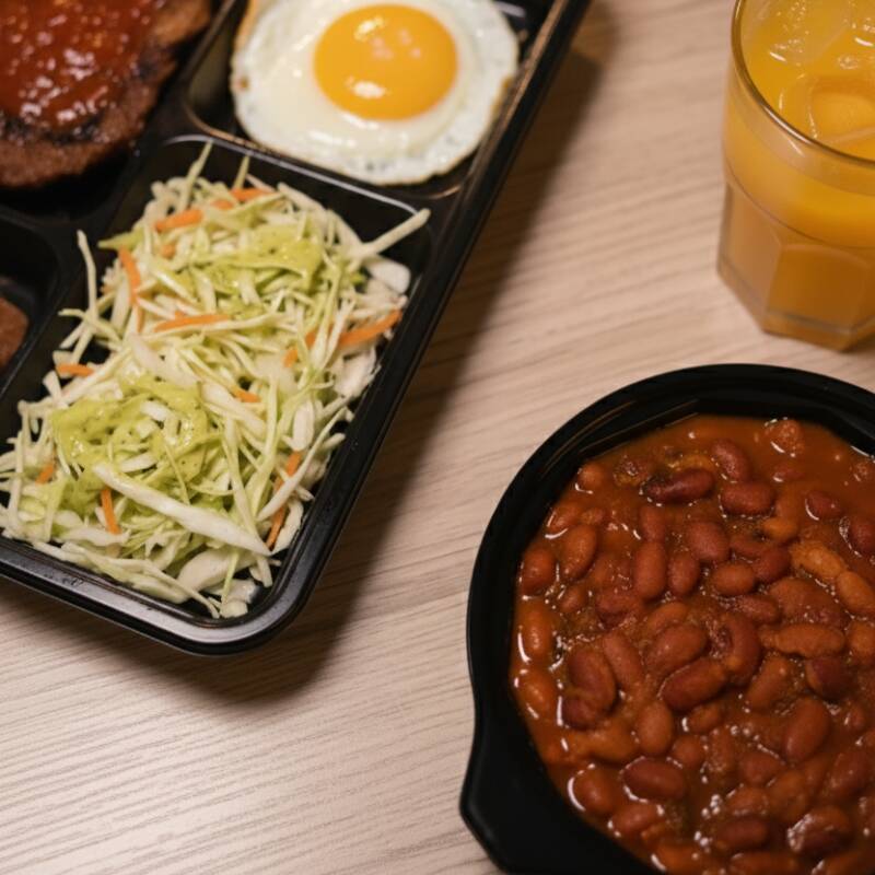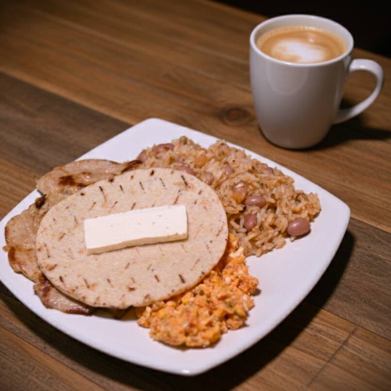 Arroz, arepa, tajada de maduro o papas a la francesa, ensalada de la casa, jugo del día, frijoles, opcional carnes: cerdo, carne, chicharrón, carne molida, pollo a la plancha.