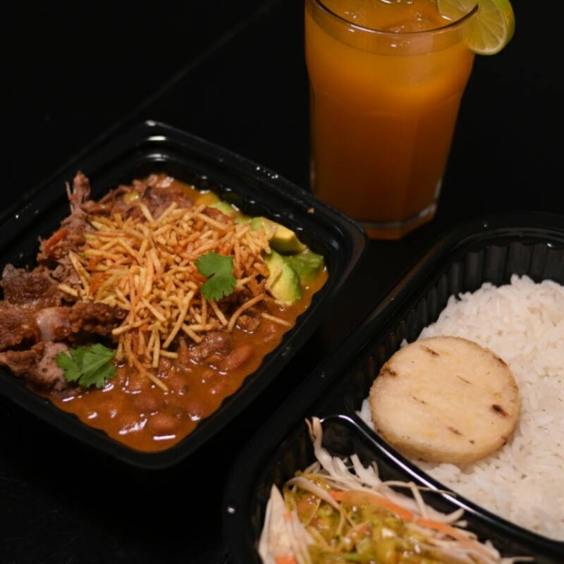 Cazuela con frijoles, chicharrón, maduro picado, ripio de papa, maicitos, chorizo picado, carne molida, aguacate, arroz, ensalada, jugo del día 12 onzas (platillo personal).