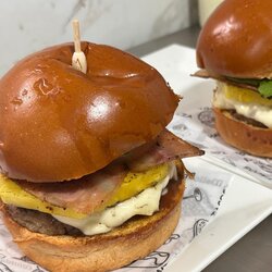 Carne artesanal, piña asada, queso mozzarella, lechuga, tocineta.