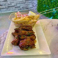 Alitas 10 uds, arepa frita, costillas 400 g y porción de papas 200 g..