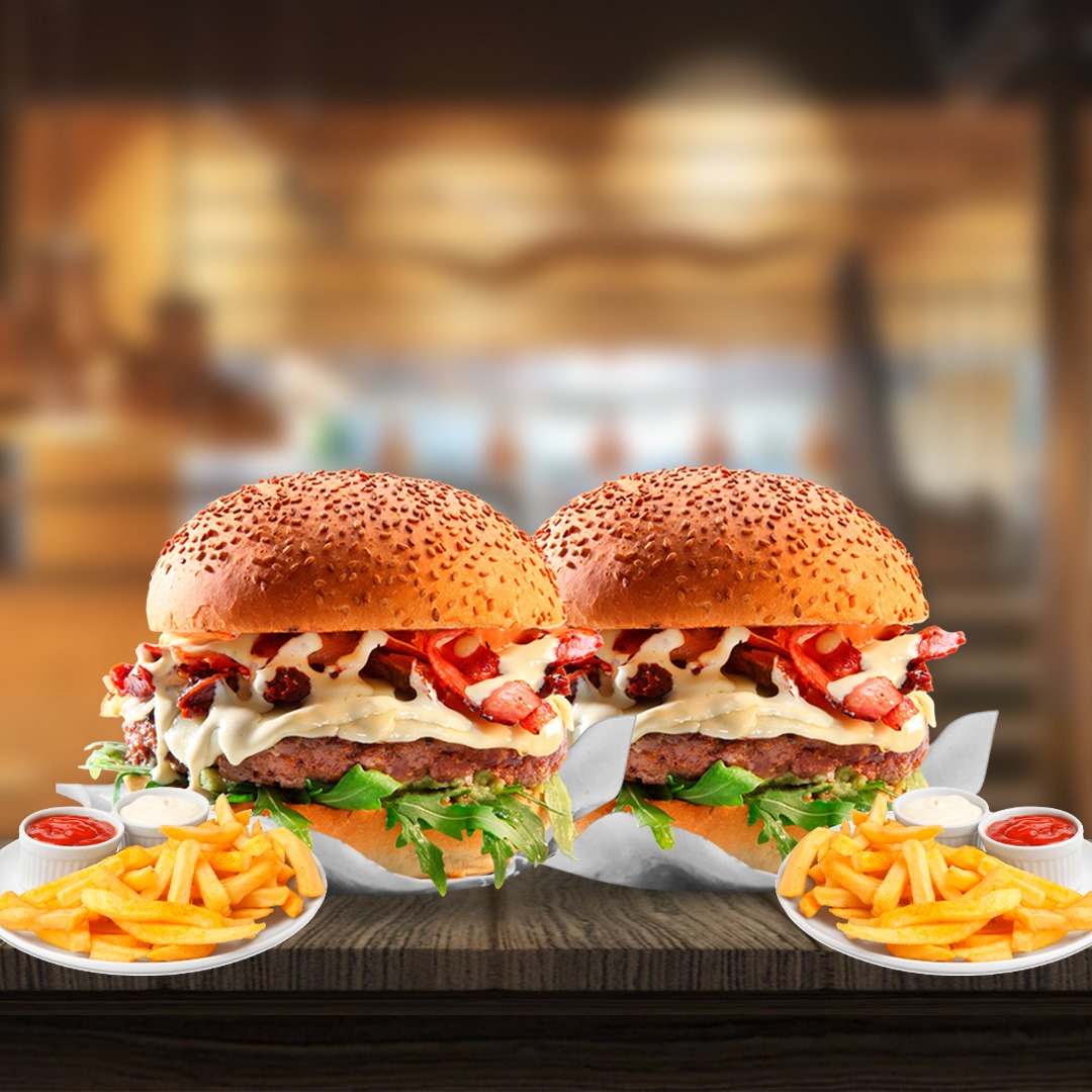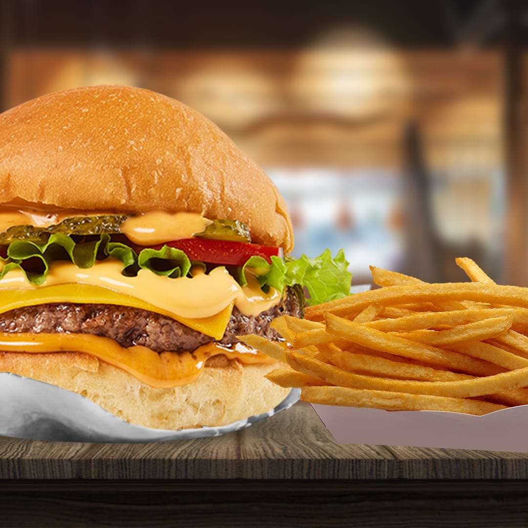 Contiene pan Bimbo, porción de 100% carne de res, queso cheddar, pepinillos, lechuga crespa,tomate cebolla morada, salsa cheddar + Papas a la francesa.