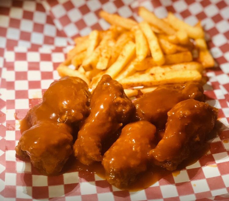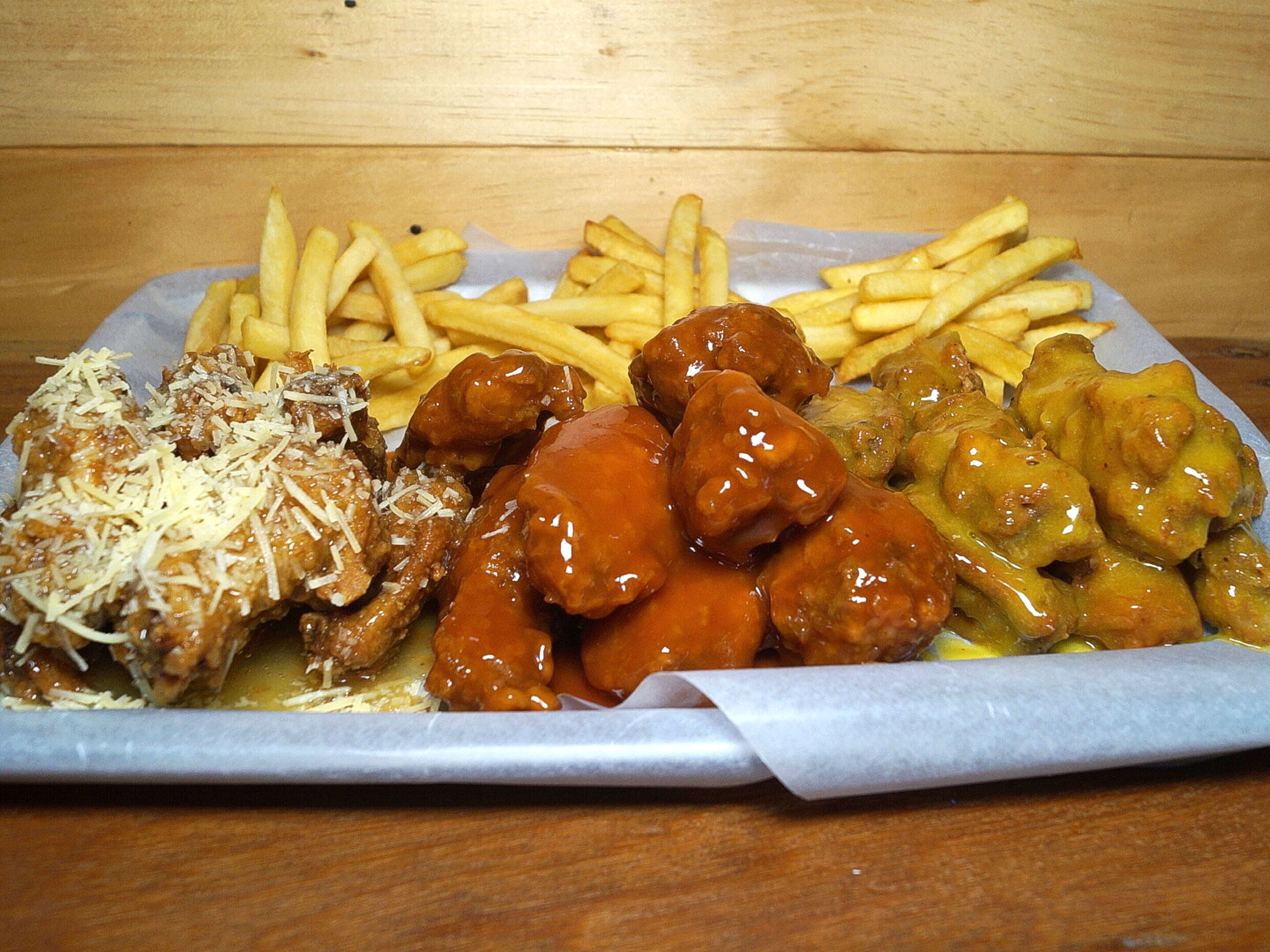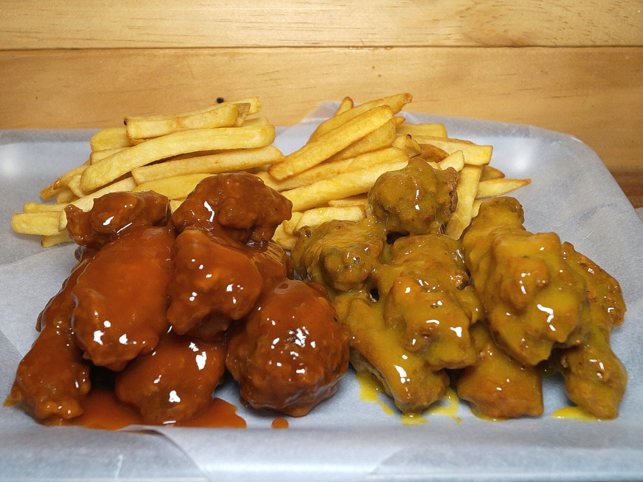 10 piezas alitas, Bañadas en dos salsas , acompañadas de papas a la francesa 150 gramos