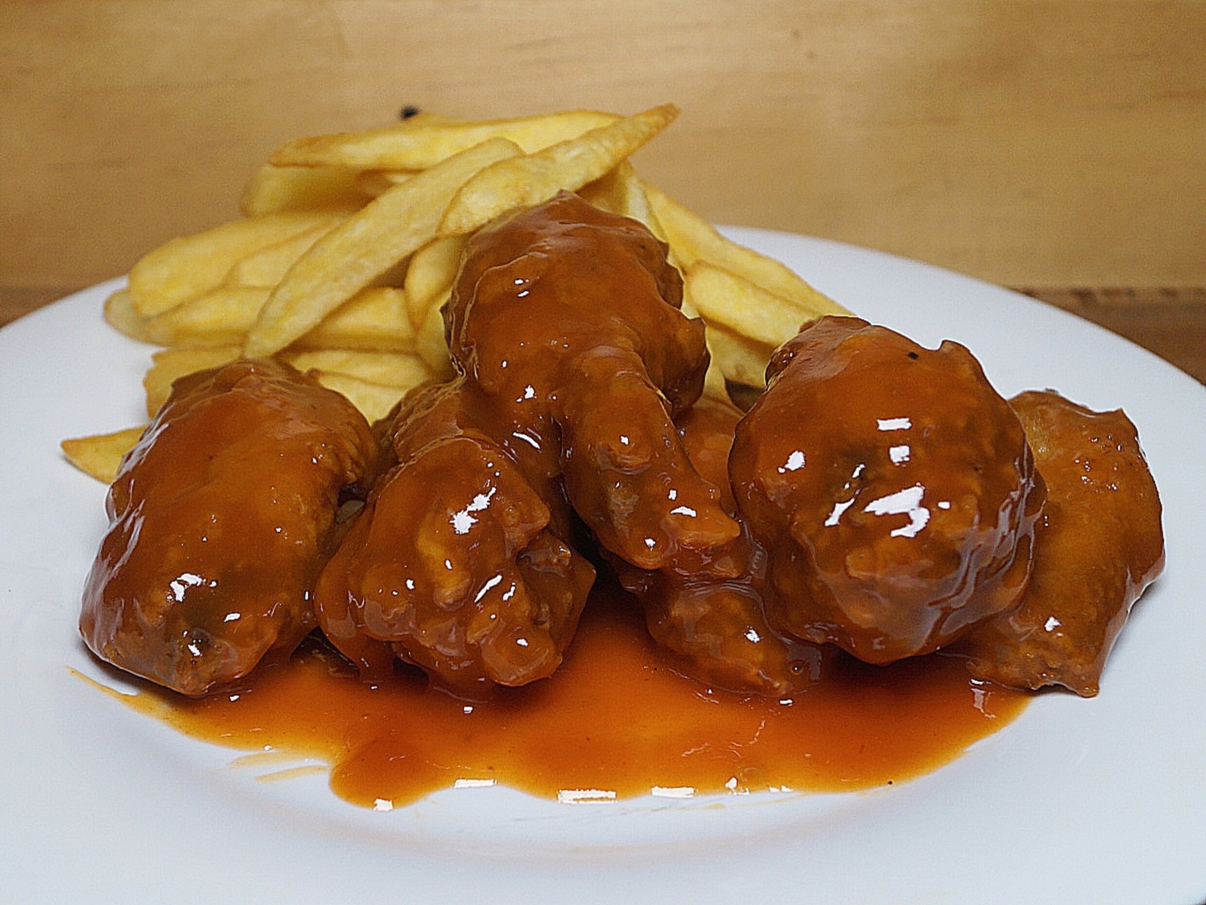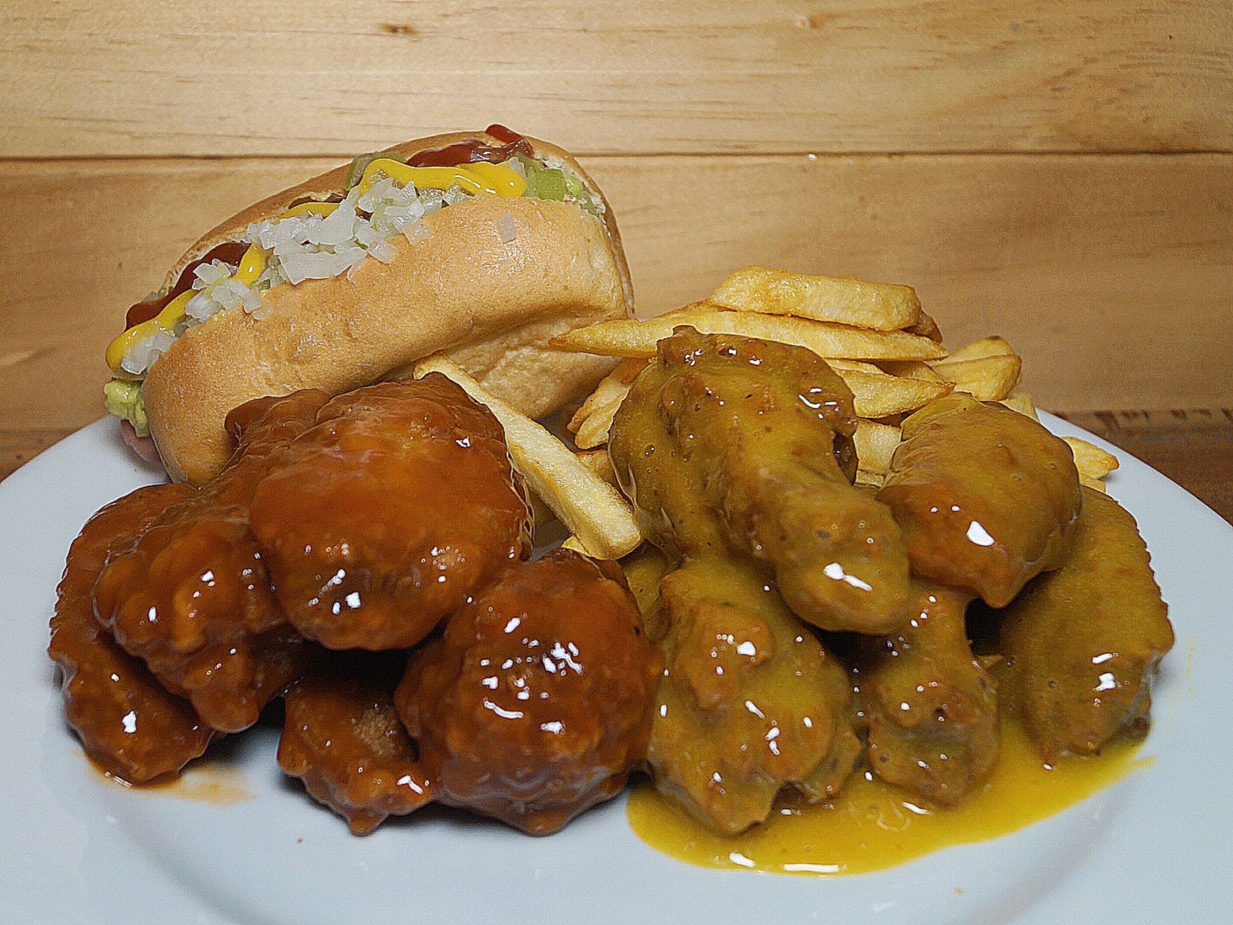 Bañadas de dos salsas y en 1 salsa sin bañar, acompañada de papas a la francesa.