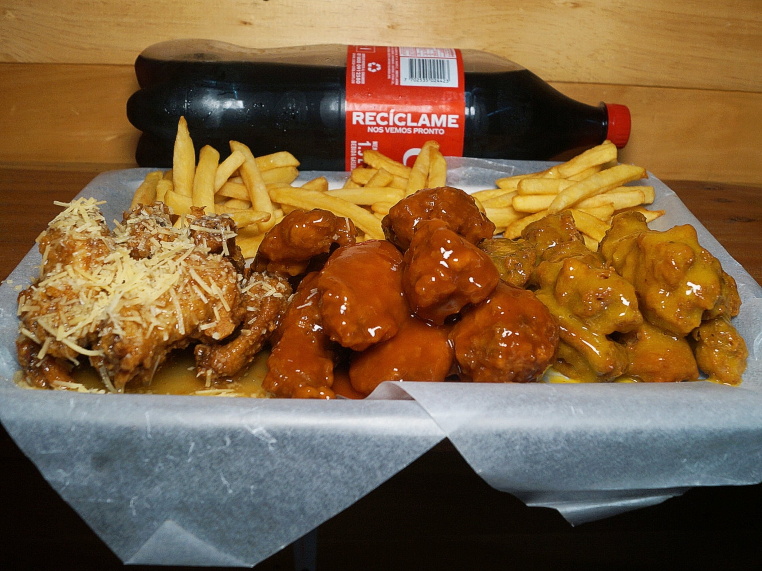 6 alitas bañadas en salsa + 100grms de papa a la francesa + gaseosa 250ml