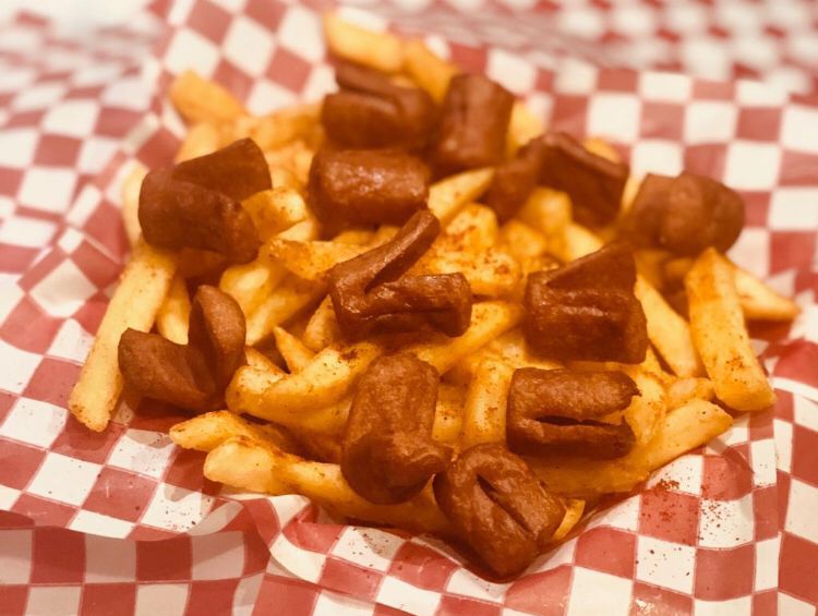 deliciosas y crocantes papas a la francesa mas trocitos de salchicha con salsas.