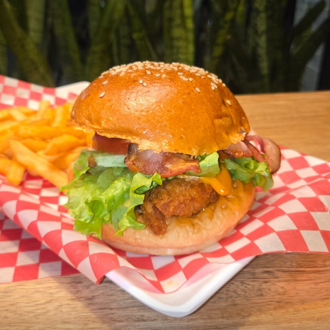 Filete de pechuga crispi, vegetales (tomate, cebolla, lechuga crespa verde), queso amarillo, tocineta y papas a la francesa + Agua saborizada.